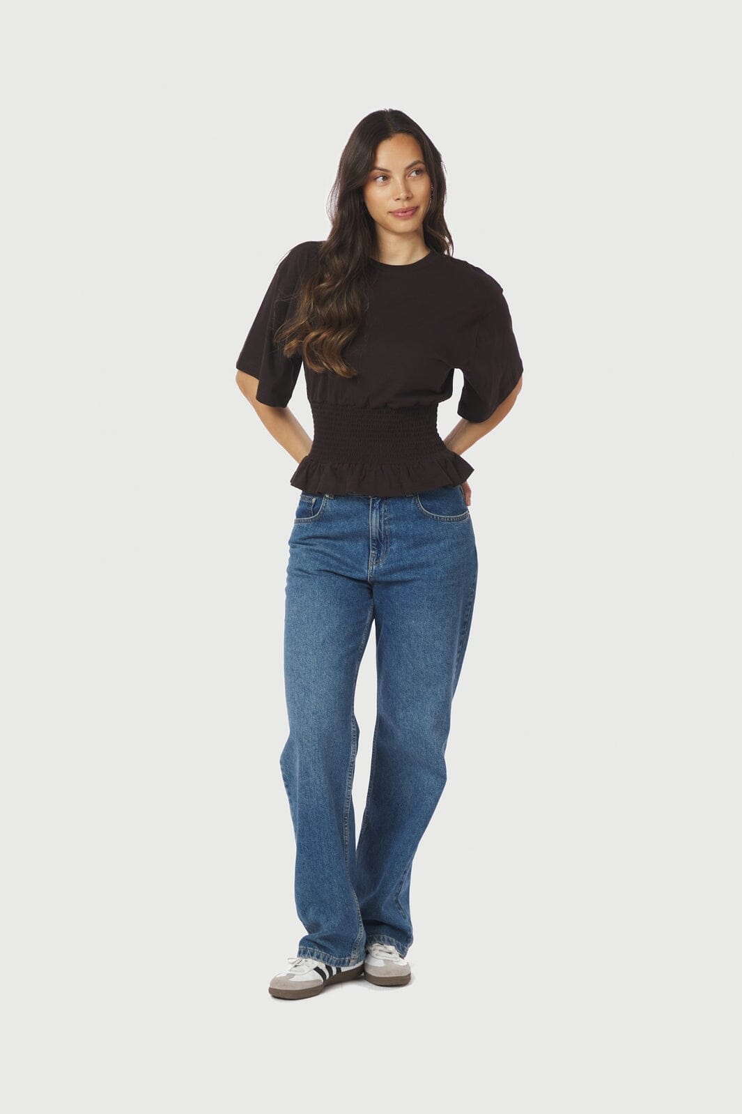 Dunkelbraunes T-Shirt von Neo Noir mit boxy Passform und Smock-Detail in der Taille. Der runde Halsausschnitt und die kurzen Ärmel verleihen dem T-Shirt einen sauberen und einfachen Look.
