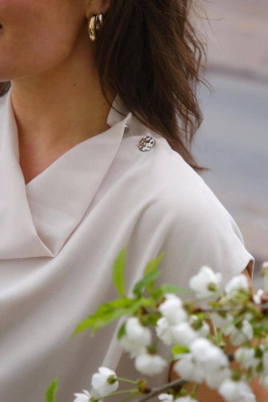 Bluse von Neo Noir in Ivory mit Cowl-Ausschnitt. Sie hat eine lockere Passform und dekorative Knöpfe an der Schulter, die ihr eine besondere Note verleihen.