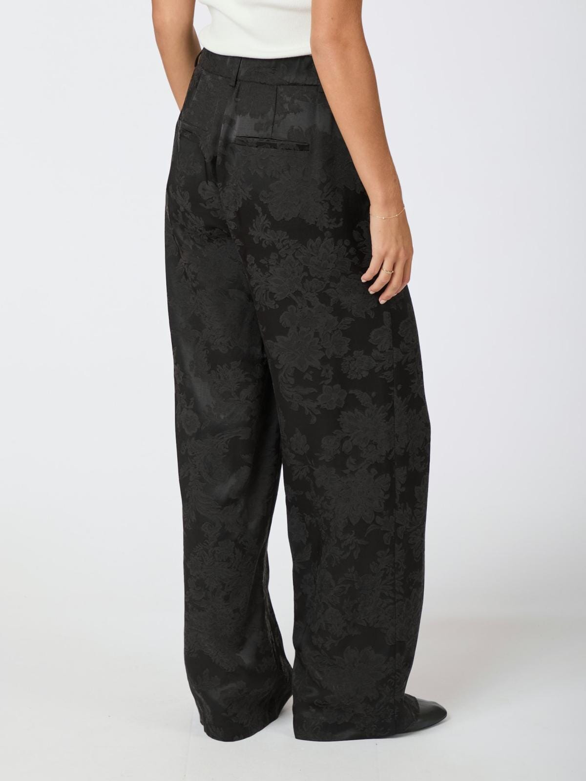 Schwarze Jacquard-Hosen von Neo Noir mit Blumenmuster in der Textur des Stoffes. Die Hosen haben eine gerade Passform und reichen bis zum Boden.