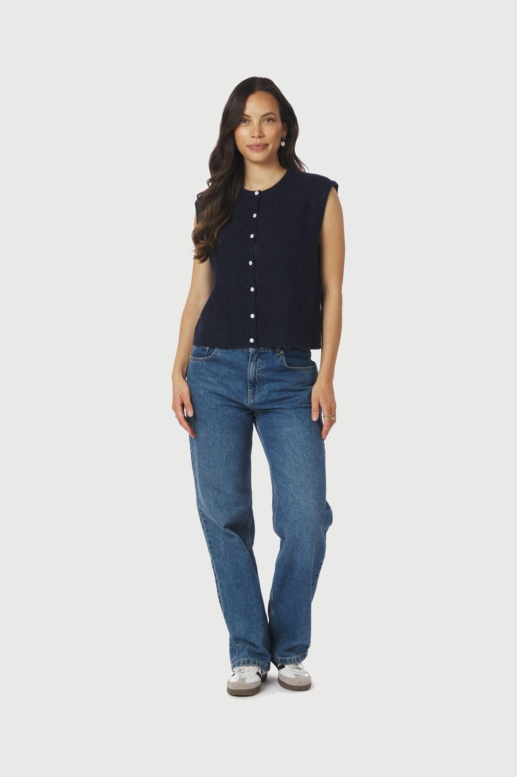 Gestrickte Weste von Neo Noir in Dunkelblau. Sie hat eine lockere Passform mit Rundhalsausschnitt und Perlenknopfverschluss vorne.