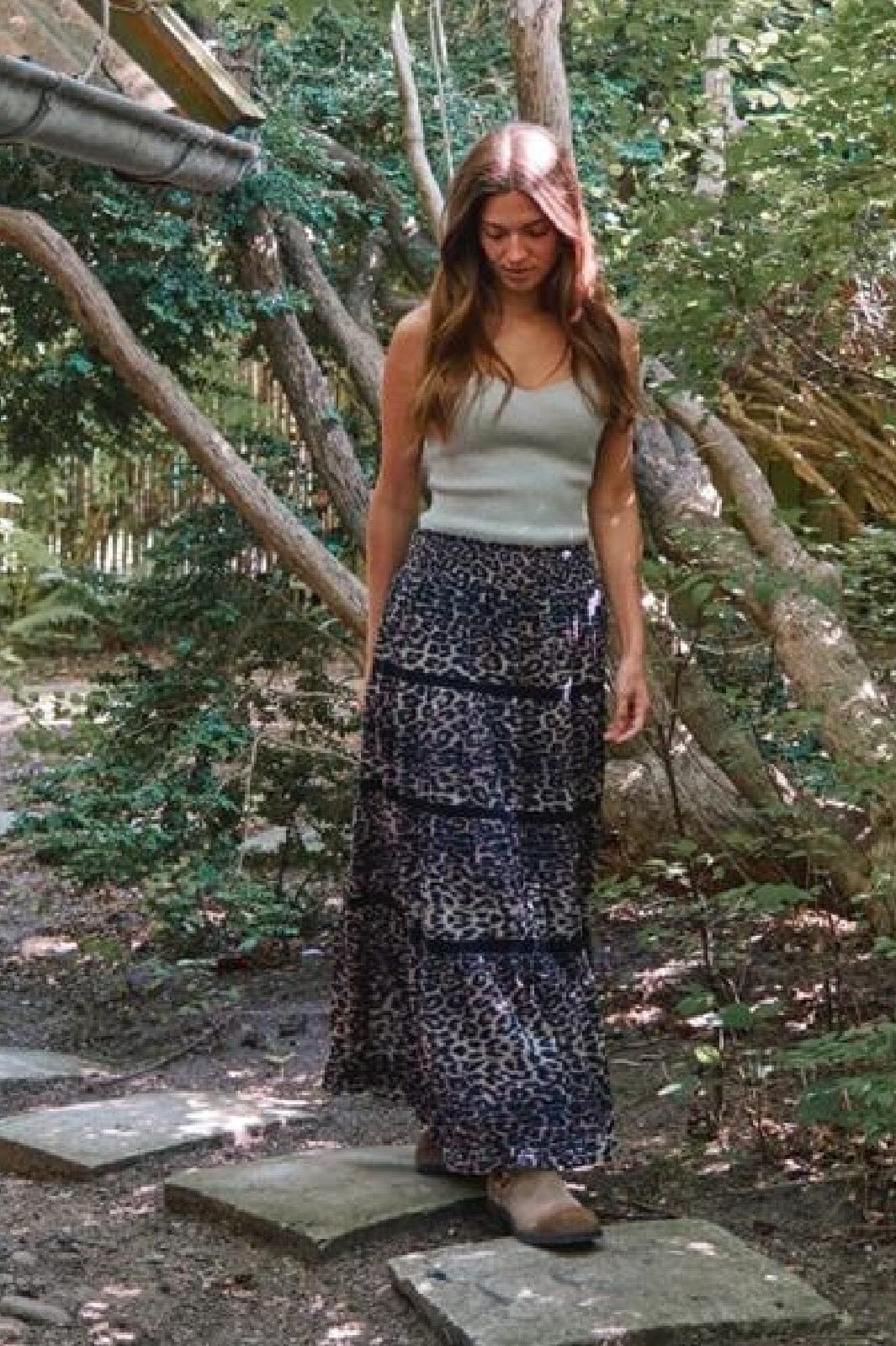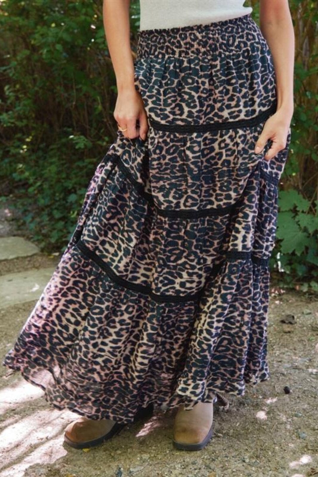 Knöchellanger Rock aus leichtem Voile-Material mit Leopardenmuster. Schwarze Akzente zwischen den Lagen verleihen dem Rock einen schönen Fall. Er kann sowohl mit einem schlichten Oberteil als auch mit einem groben Strickpullover gestylt werden.