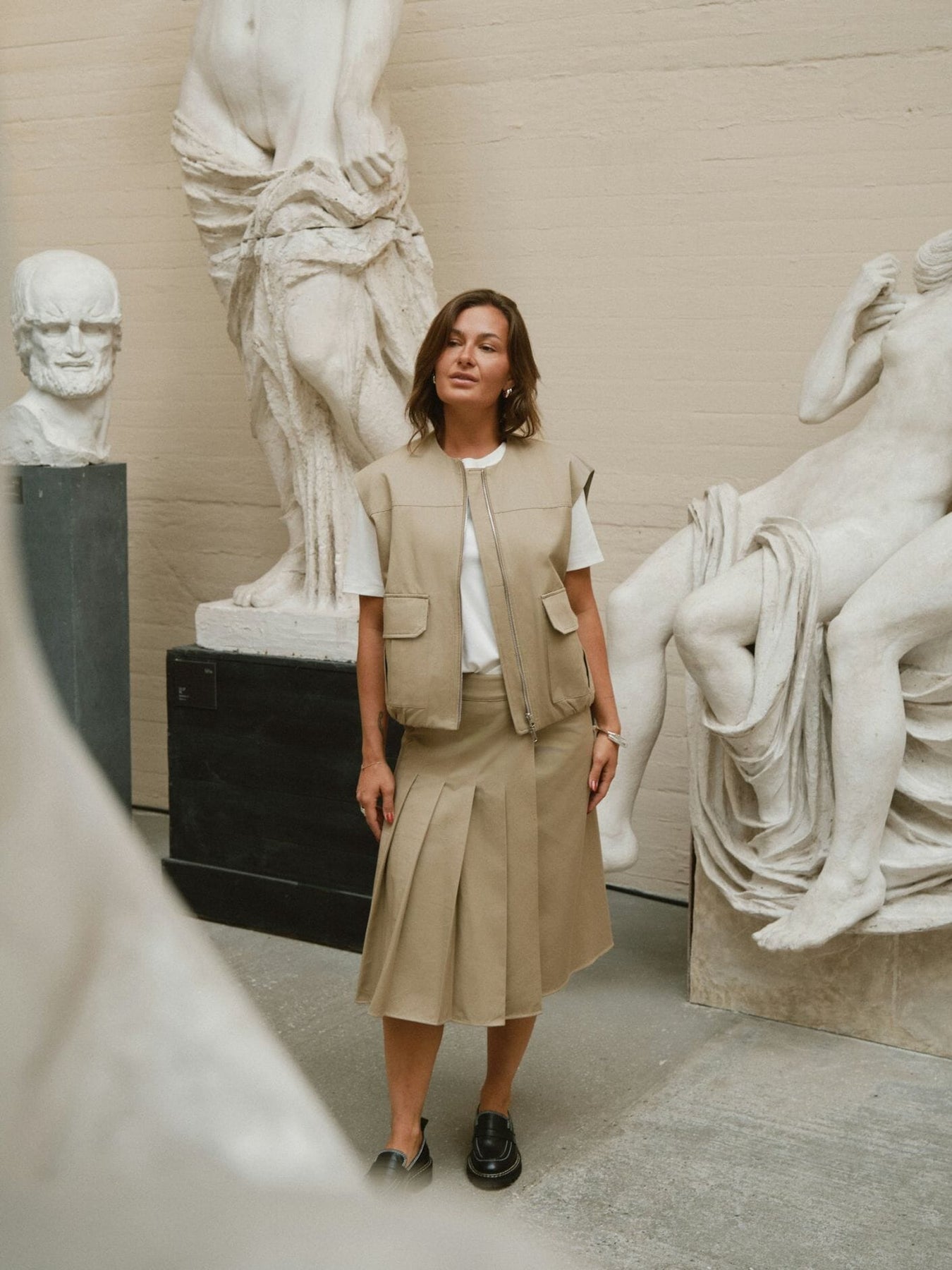 Ärmellose Weste von Neo Noir in Taupe. Sie hat eine Oversize-Passform mit Ballon-Effekt und großen Cargo-Taschen auf der Vorderseite. Reißverschluss und runder Halsausschnitt.