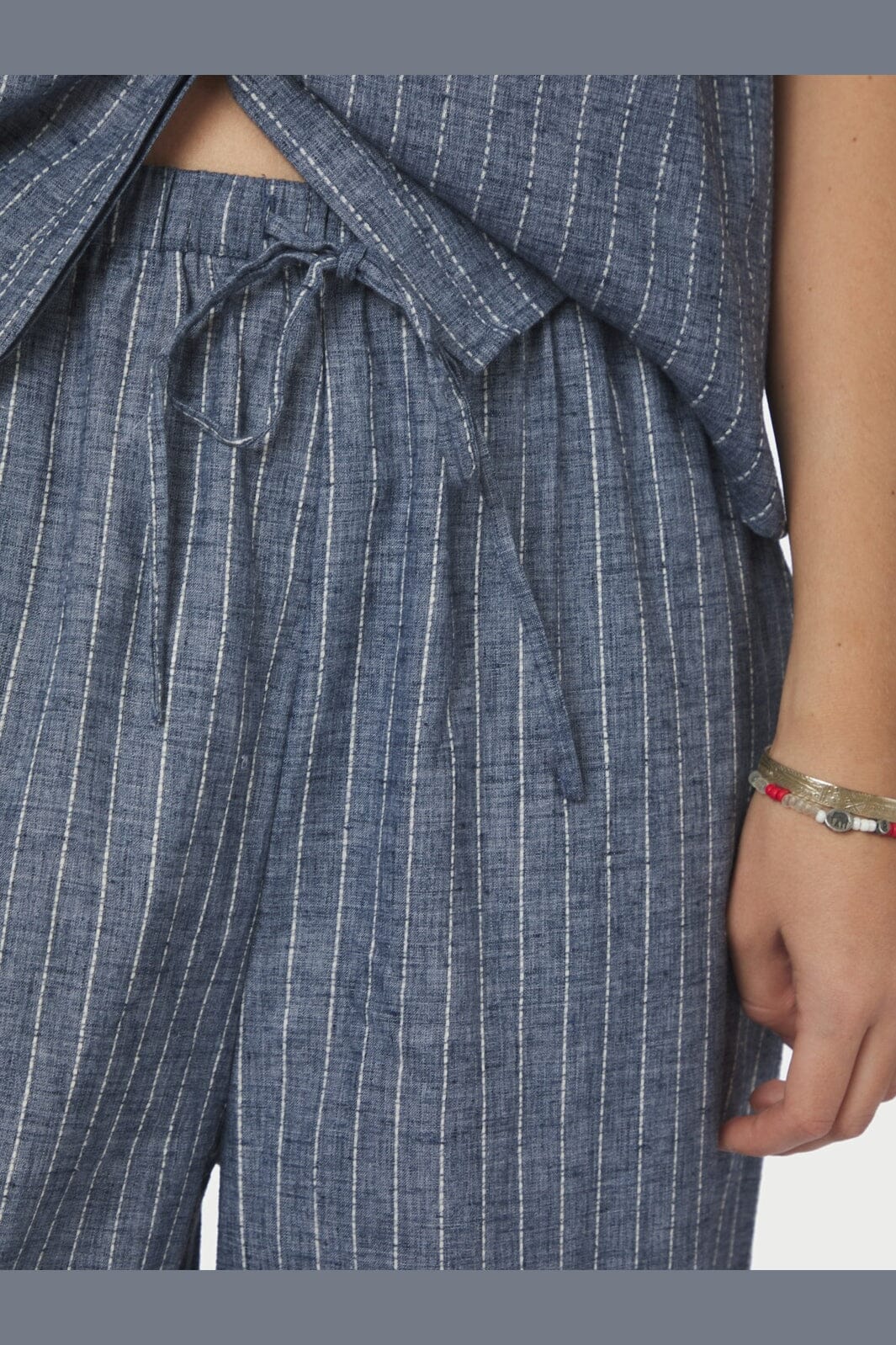 Blaue Hose von Neo Noir mit vertikalen Streifen. Die Hose besteht aus Baumwolle und verfügt über Stickereien sowie Kordeldetails, die ihr eine besondere Note verleihen.