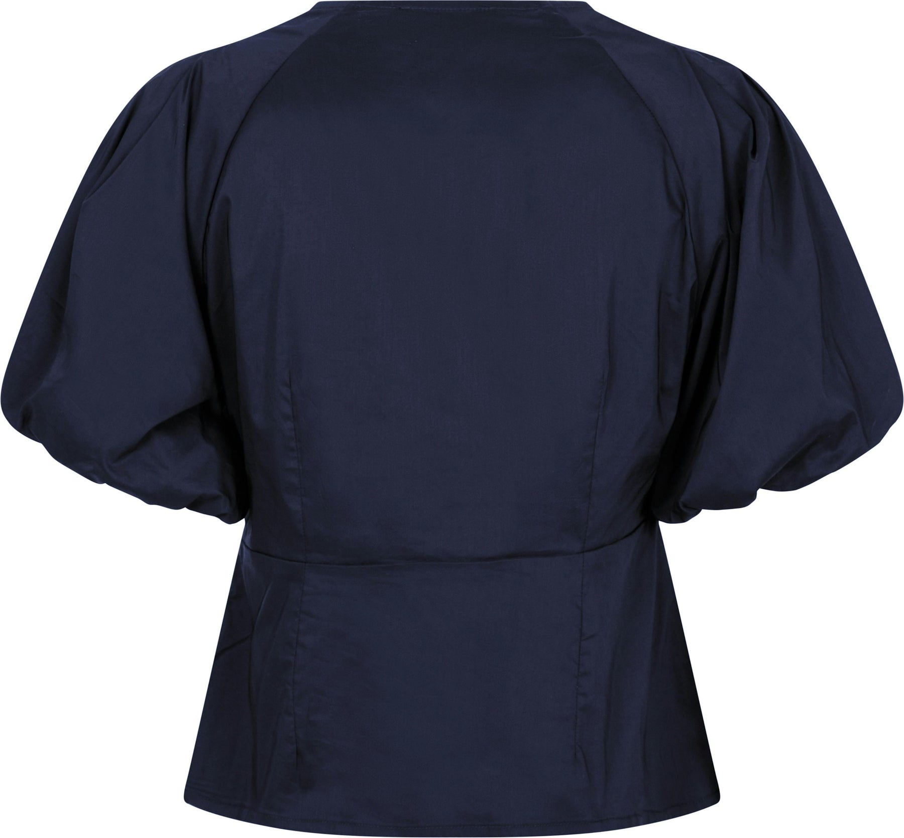 Dunkelblaue Popeline-Bluse von Neo Noir mit V-Ausschnitt und Rüschensaum. Die Bluse hat Puffärmel und eine taillierte Passform mit verstecktem Reißverschluss an der Seite.