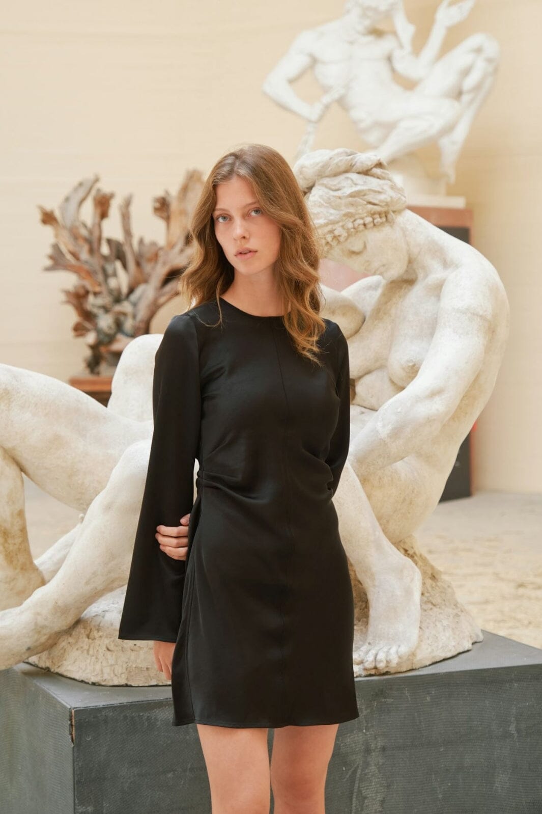 Schwarzes Satinkleid mit enger Silhouette und langen Ärmeln. Das Kleid hat Rüschendetails und weite Ärmel. Ein Reißverschluss auf der Rückseite macht es einfach an- und auszuziehen.