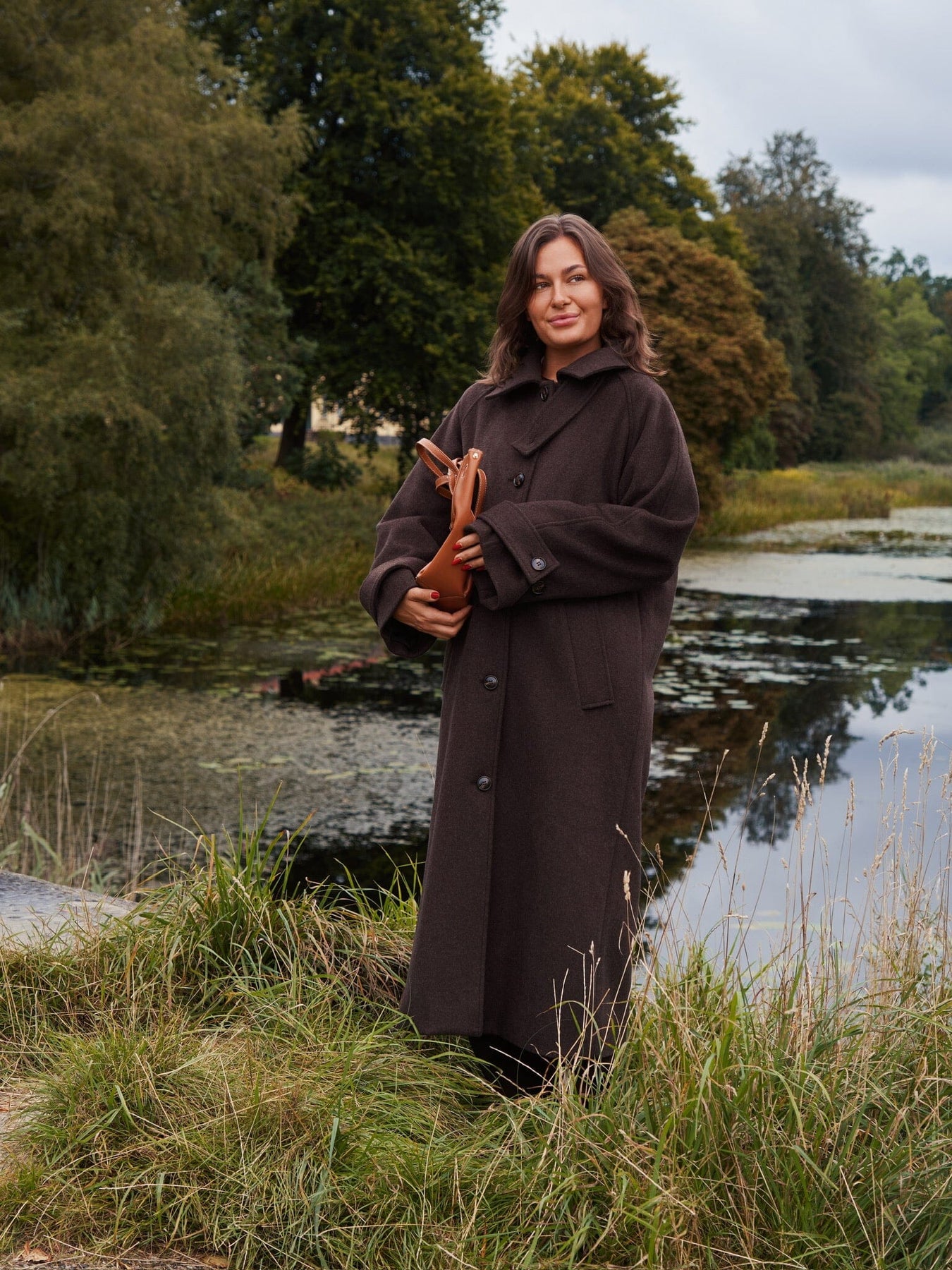 Ein schicker langer Trenchcoat aus hochwertiger Wolle. Der Mantel hat elegante Details mit Knopfverschluss am Kragen und an den Ärmeln. Das Model ist 176 cm groß und trägt Größe 36.