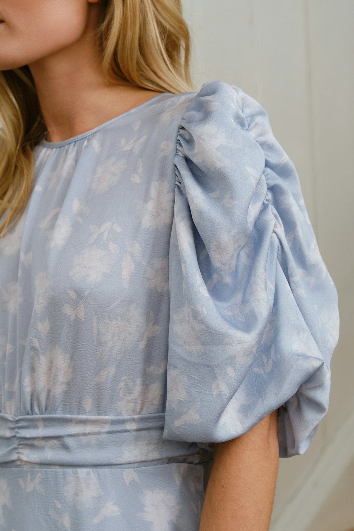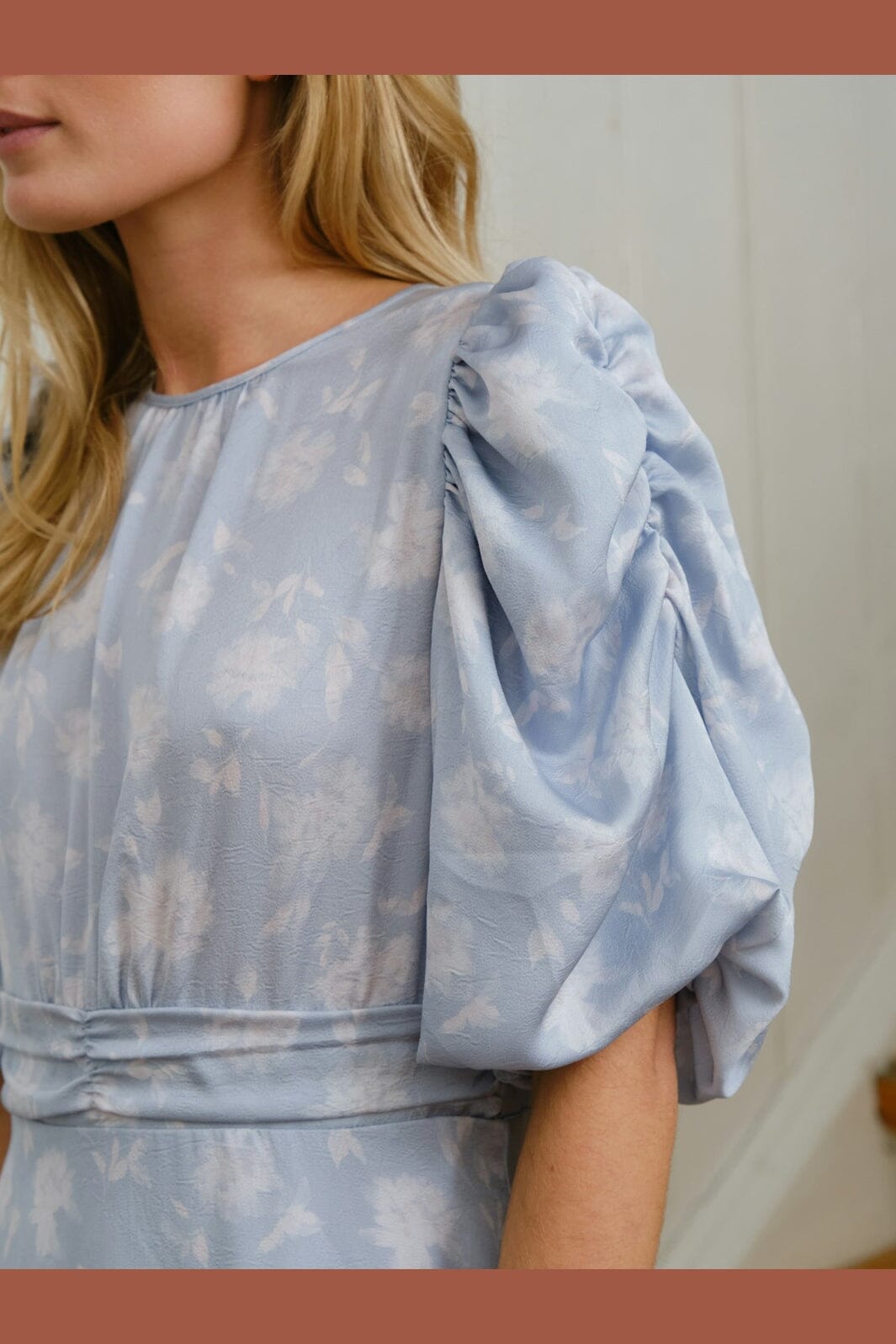 Langes Kleid von Neo Noir in einem hellblauen Farbton mit Blumenprint. Das Kleid hat 3/4-Ärmel, einen Rundhalsausschnitt und dekorative Nähte.