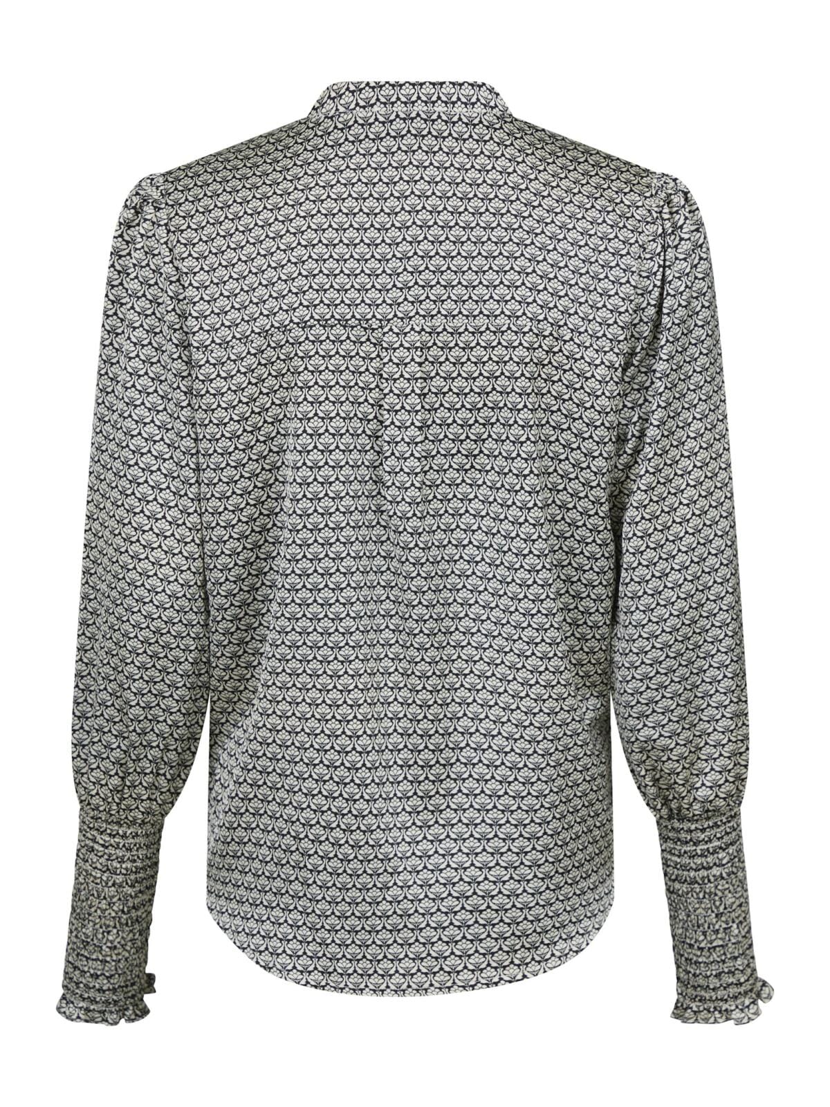 Schwarze Bluse von Neo Noir mit grafischem Muster. Die Bluse hat lange Ärmel mit Smockmanschetten und einen offenen V-Ausschnitt. Der grafische Druck in Schwarz und Weiß verleiht einen klaren und modernen Look.