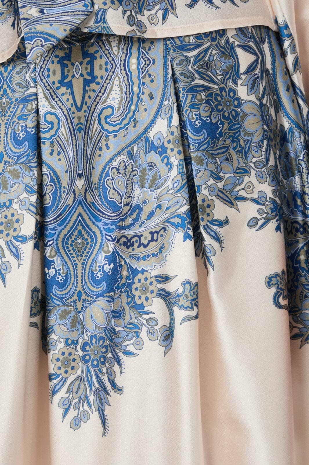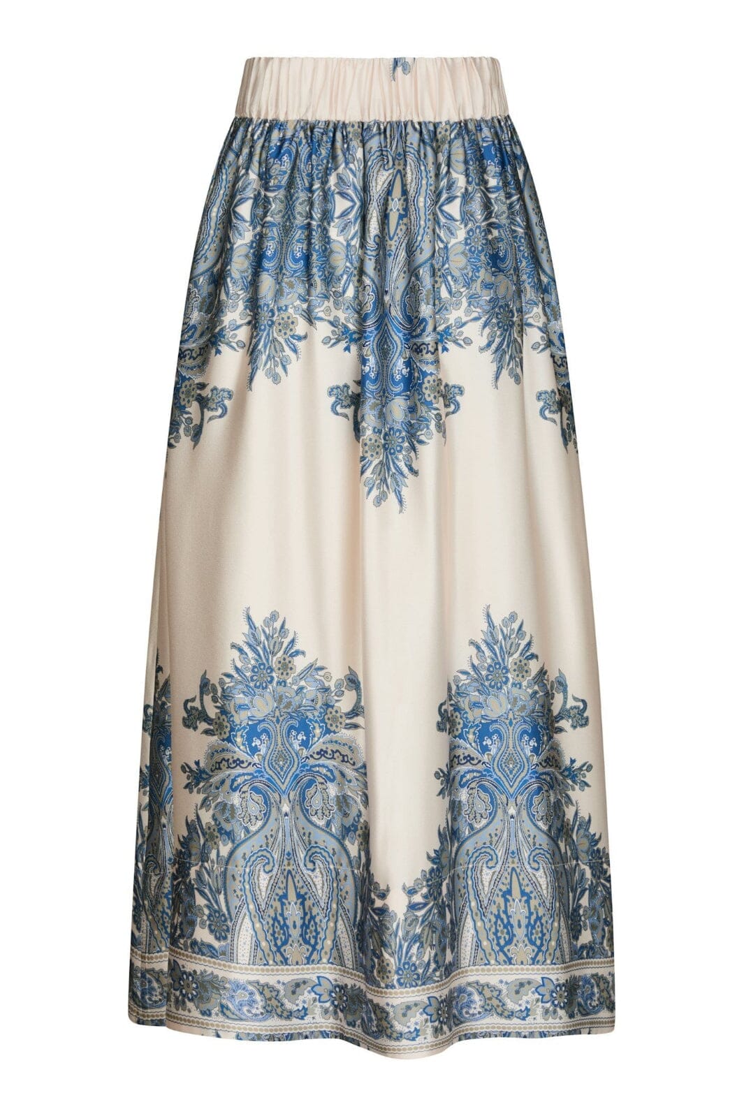 Rock von Neo Noir mit Paisley-Muster auf hellem Grund. Er hat blaue Muster und Falten, die bis zu den Waden reichen. Der elastische Bund sorgt für gute Beweglichkeit.