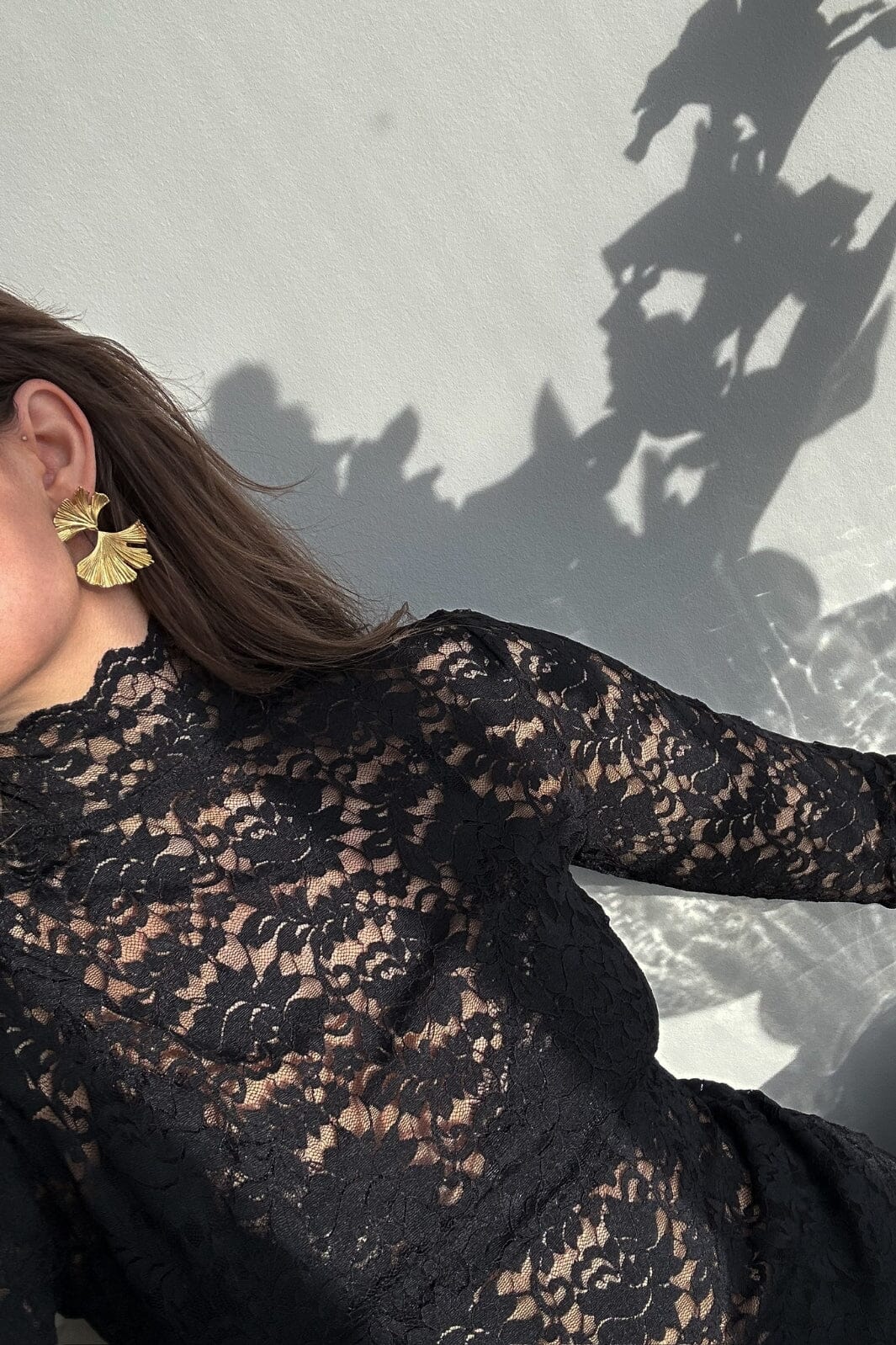 Schwarze Spitzenbluse von Neo Noir mit hohem Kragen und Blumenmuster. Die Bluse hat lange Ärmel und Knöpfe als Verschluss.