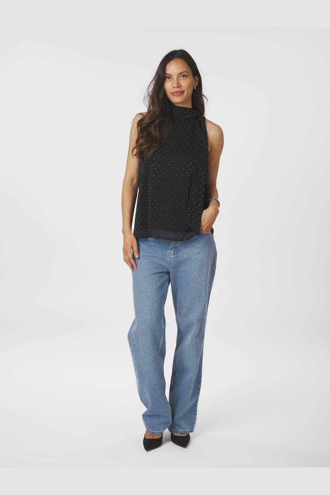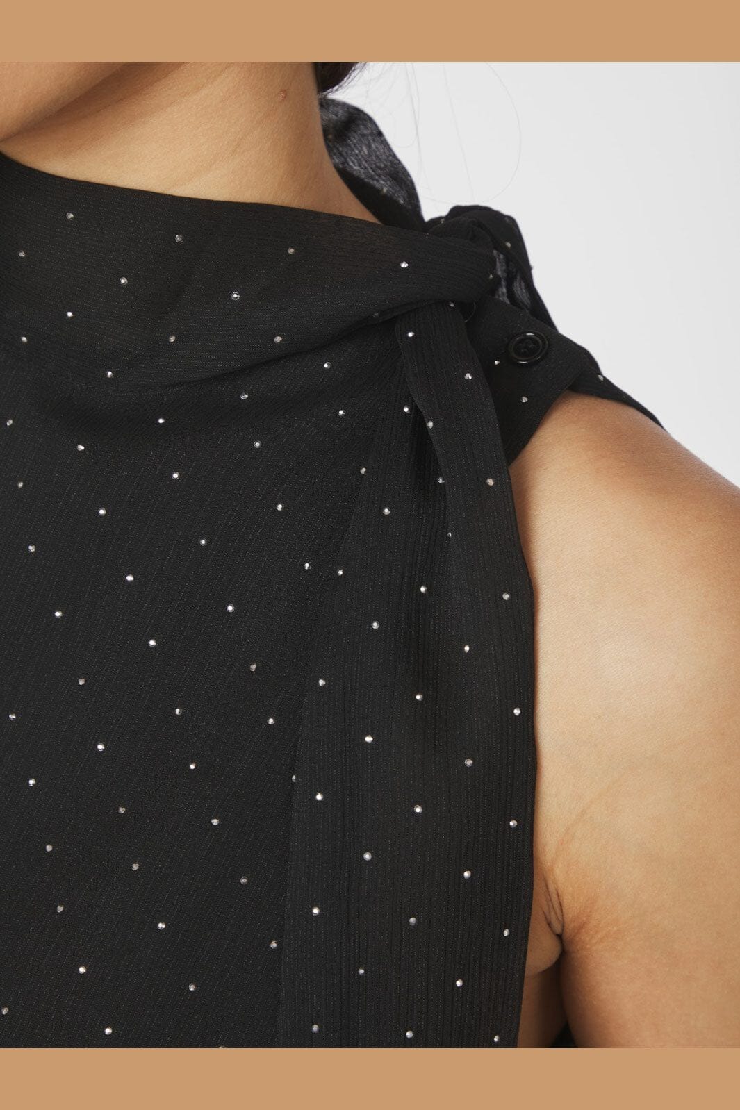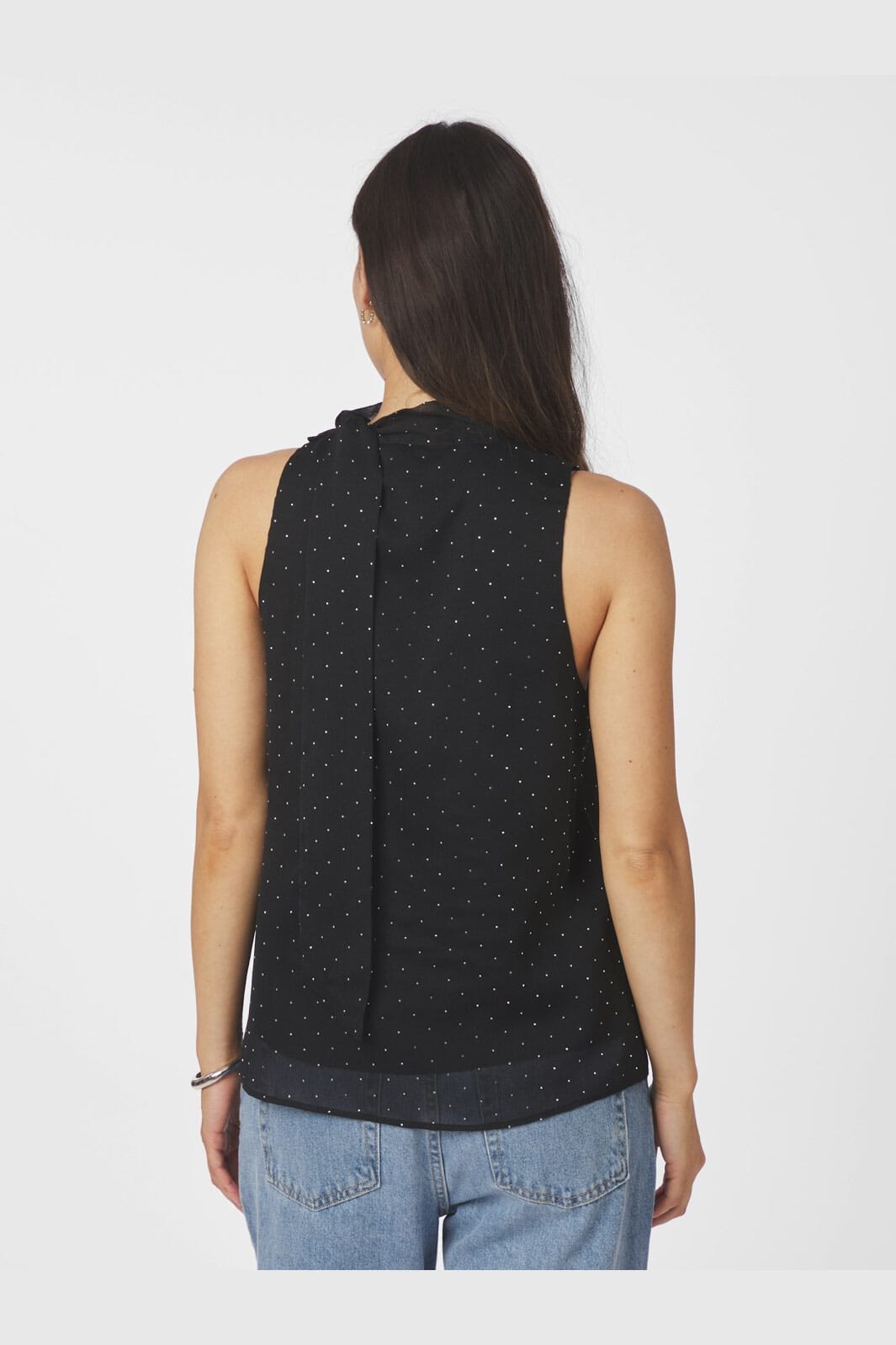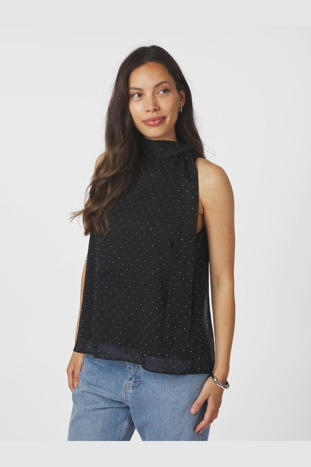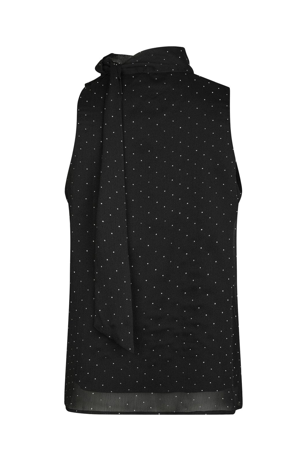 Schwarzes Top von Neo Noir mit weißen Punkten und hohem Kragen. Das Top hat eine lockere Passform und ist aus Chiffon mit aufgenähten Steinen und Bindeband am Kragen gefertigt.