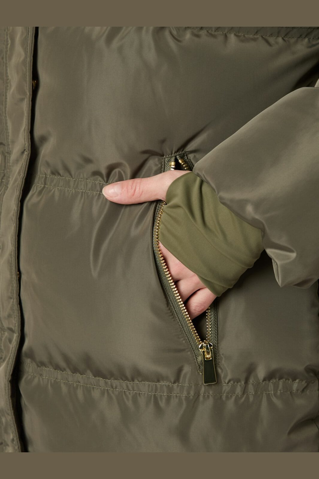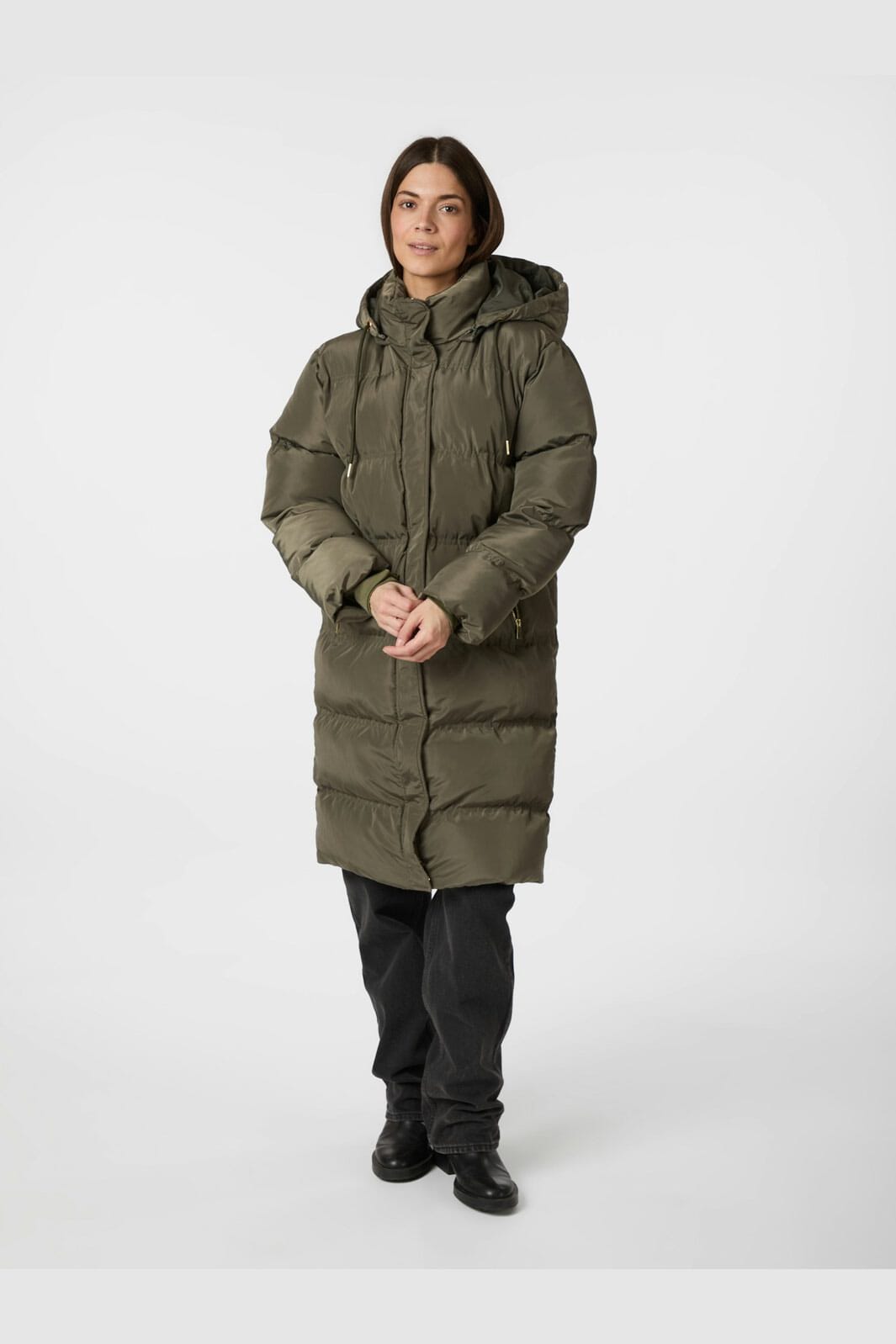 Gepolsterte Jacke, halb lang und mit abnehmbarer Kapuze. Die Details sind feminin in Form von goldfarbenem Metall. Das Model ist 176 cm groß und trägt Größe 36.