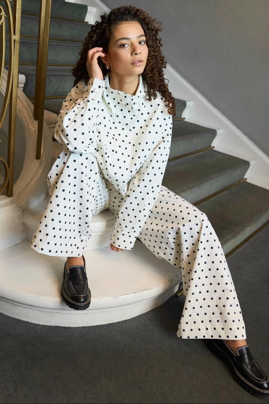 Weiße Hose von Neo Noir mit schwarzen Punkten. Die Hose hat eine hohe Taille und ist bodenlang mit lockerer Passform und weitem Bein.