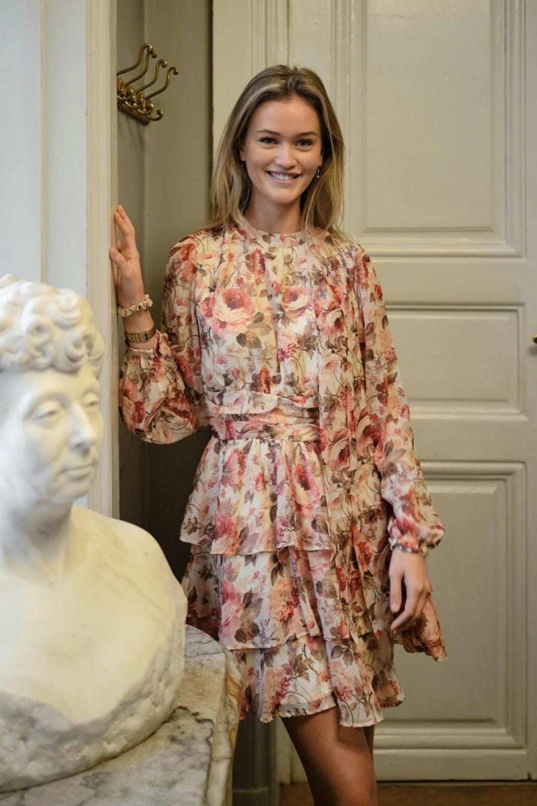 Kleid von Neo Noir mit Blumenprint in Creme- und Rottönen. Es hat einen hohen Kragen mit Bindedetail, lange Ärmel und eine lockere Passform.