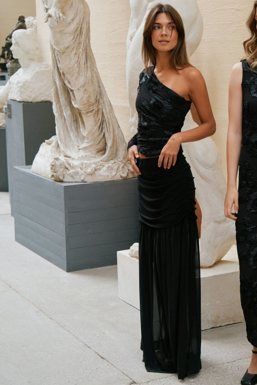 Schwarzer Rock von Neo Noir mit einem geschichteten Design. Der obere Teil ist gefüttert und liegt eng am Körper an, während der untere Teil transparent ist mit Rüschendetails und einer weiten Passform.