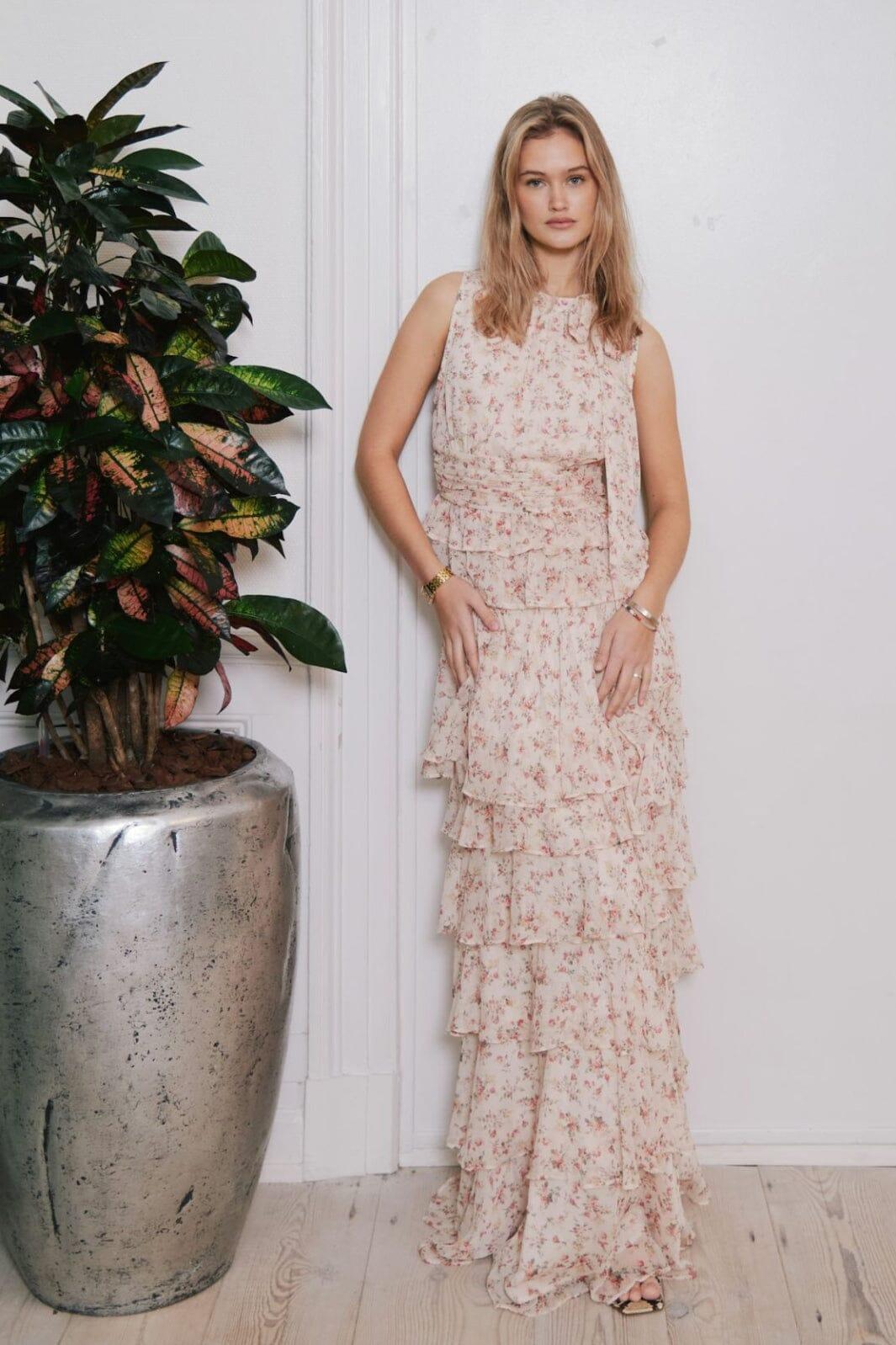 Rock von Neo Noir in einem cremefarbenen Ton mit Blumenprint in hellen Nuancen. Der Rock hat mehrere Stofflagen mit Rüschen und Falten.