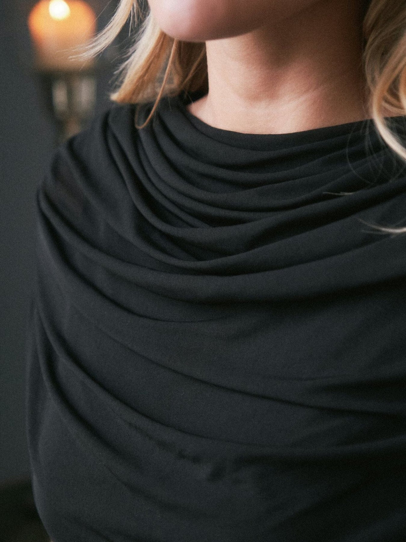 Schwarzes Mesh-Kleid von Neo Noir mit drapiertem Design. Das Kleid hat Raffungen entlang der Seitennähte und einen Wasserfalleffekt vorne, der Bewegung im Stoff erzeugt.