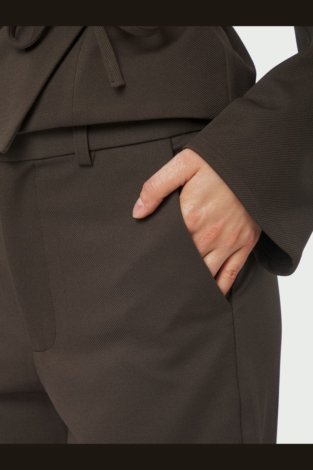 Dunkelbraune Hosen von Neo Noir mit hoher Taille und lockerem Schnitt. Die Hosen haben gerade Beine und Gürtelschlaufen und reichen bis zum Boden.