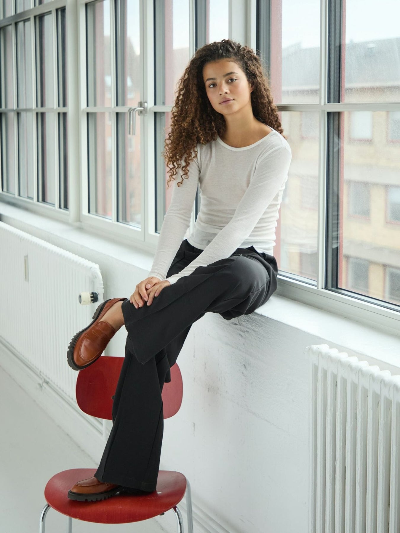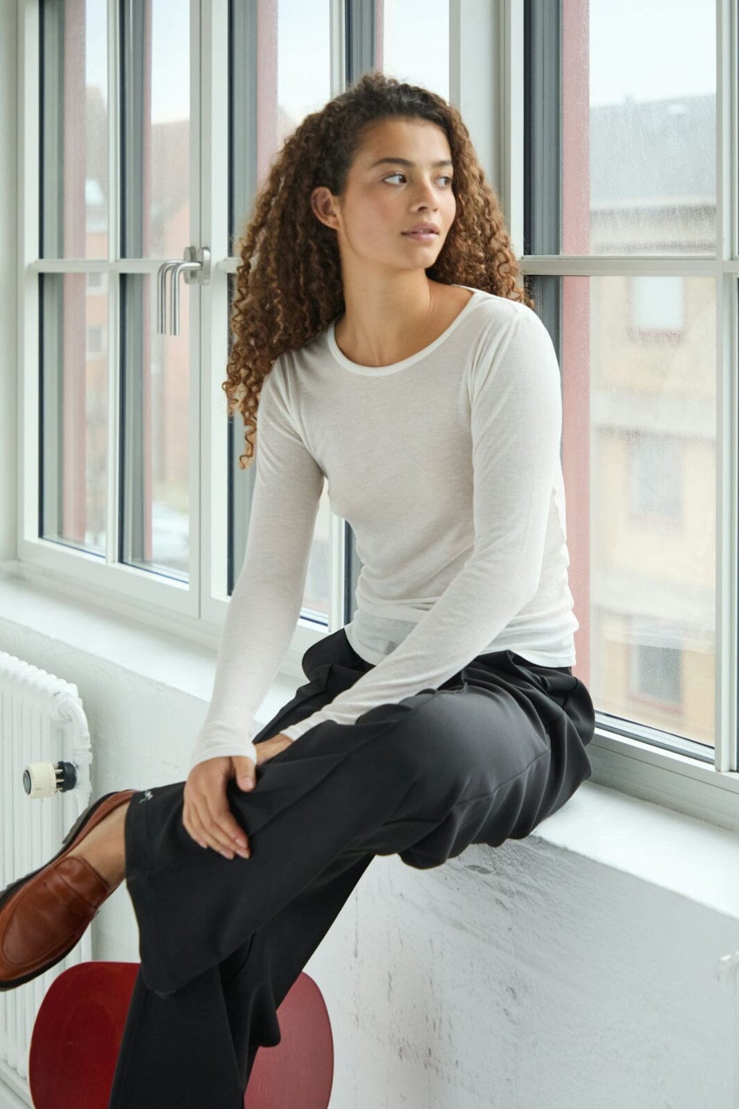 Weißes Rippstrick-Top von Neo Noir mit Rundhalsausschnitt und langen Ärmeln. Das Top hat eine eng anliegende Passform und ist aus einer weichen und leichten Rippstrickqualität gefertigt.