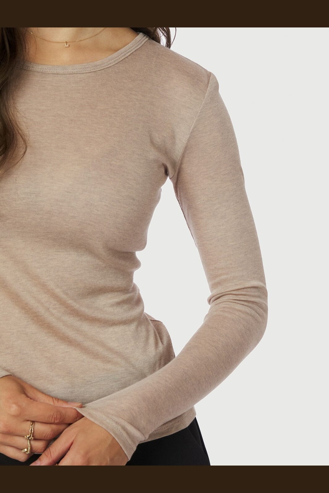 Beige melange-Pullover von Neo Noir aus geripptem Material. Ein figurbetonter Pullover mit Rundhalsausschnitt und langen Ärmeln in einer neutralen Farbe, die zu vielen anderen Farben passt.