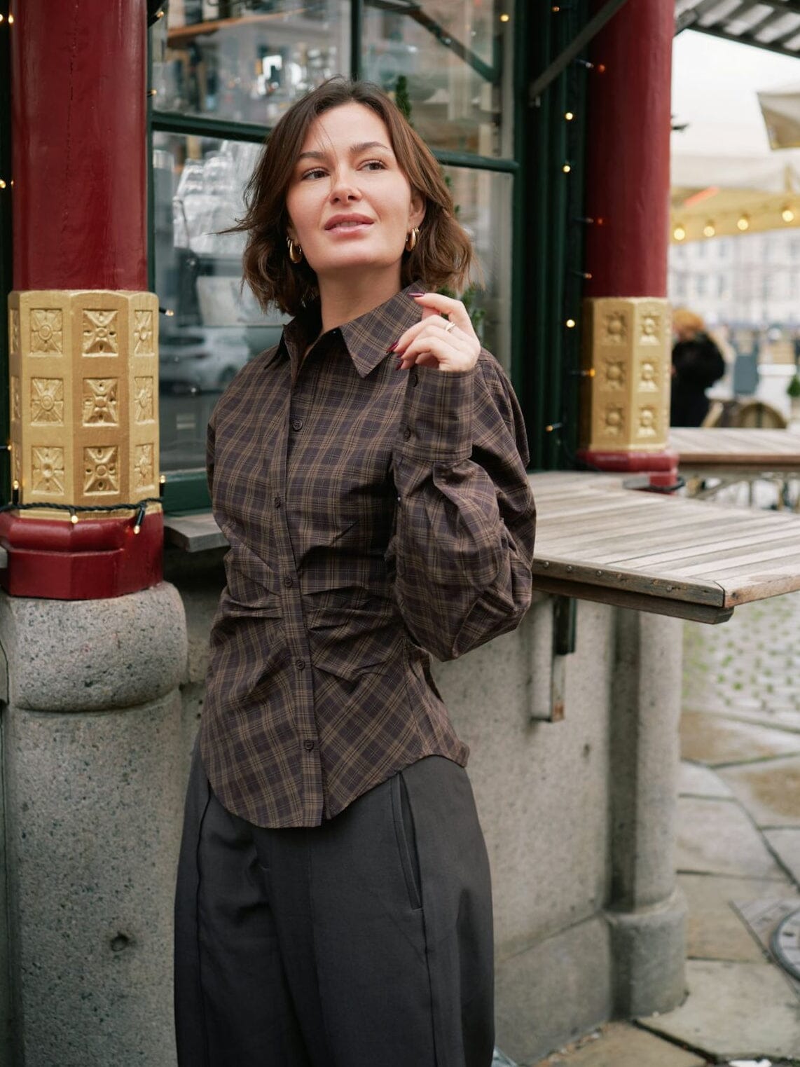 Dunkelbraunes kariertes Hemd von Neo Noir mit asymmetrischer Knopfleiste. Das Hemd hat einen klassischen Hemdkragen und Raffdetails, die ihm einen einzigartigen Look verleihen.