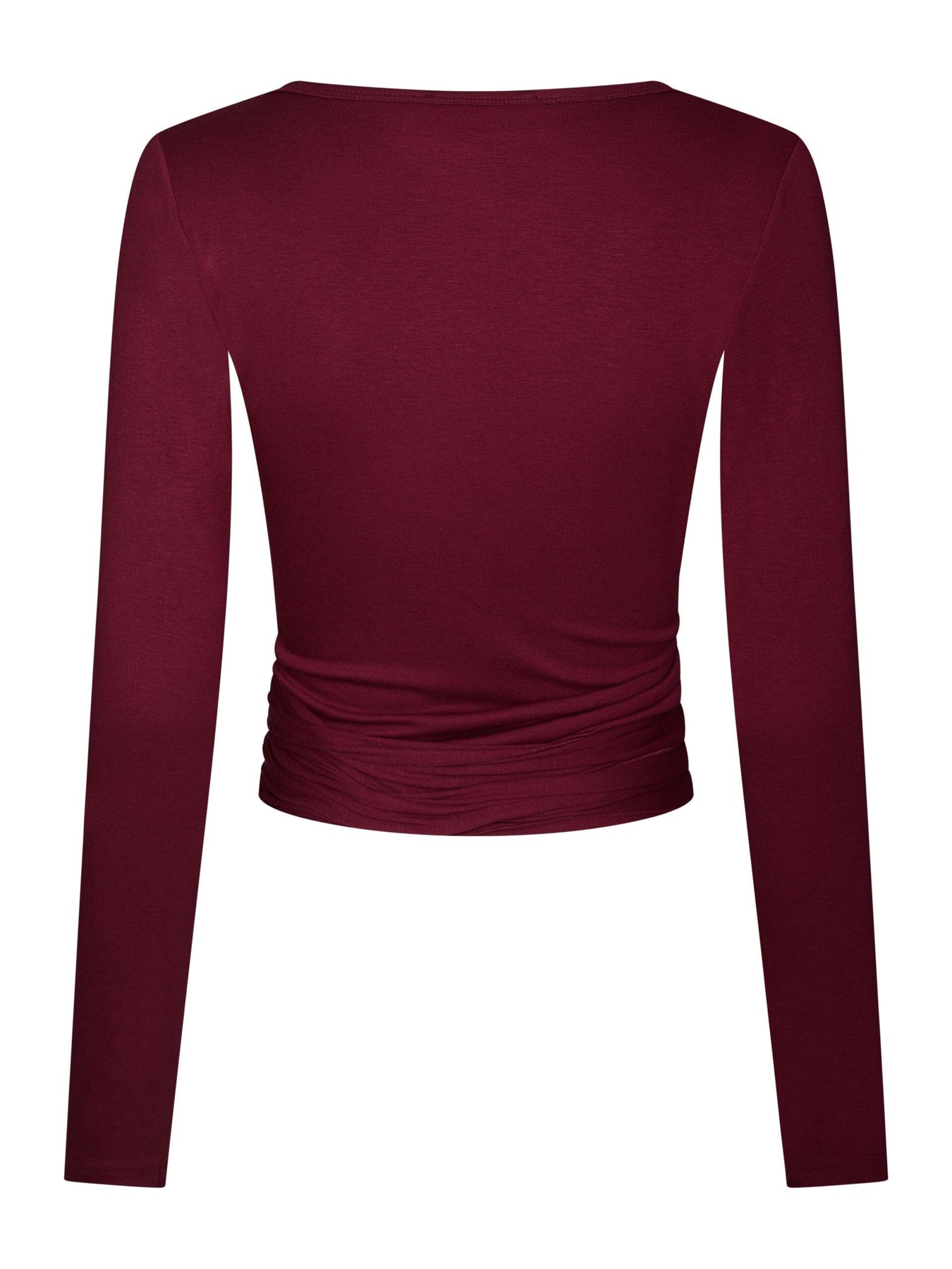 Wickelbluse von Neo Noir in einem tiefroten Farbton. Die Bluse besteht aus weichem Jersey mit 91% Viskose und 9% Elasthan.