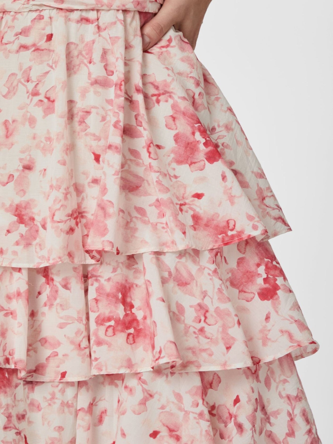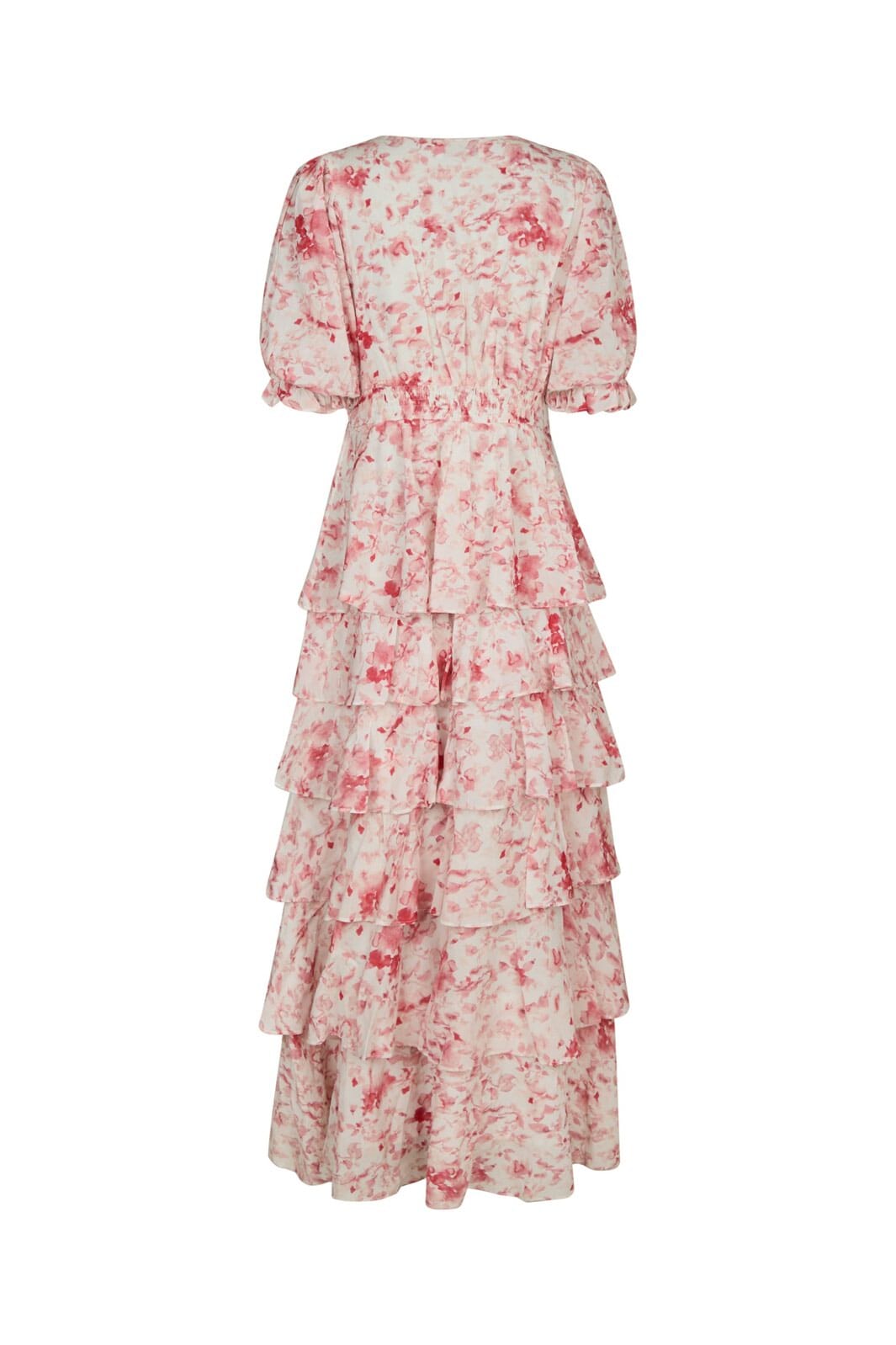 Langes Kleid von Neo Noir mit Blumenmuster in roten Nuancen. Das Kleid hat einen V-Ausschnitt, kurze Puffärmel und mehrere Lagen Rüschen von der Taille abwärts. Ein elastischer Bund sorgt für eine lockere und bequeme Passform.
