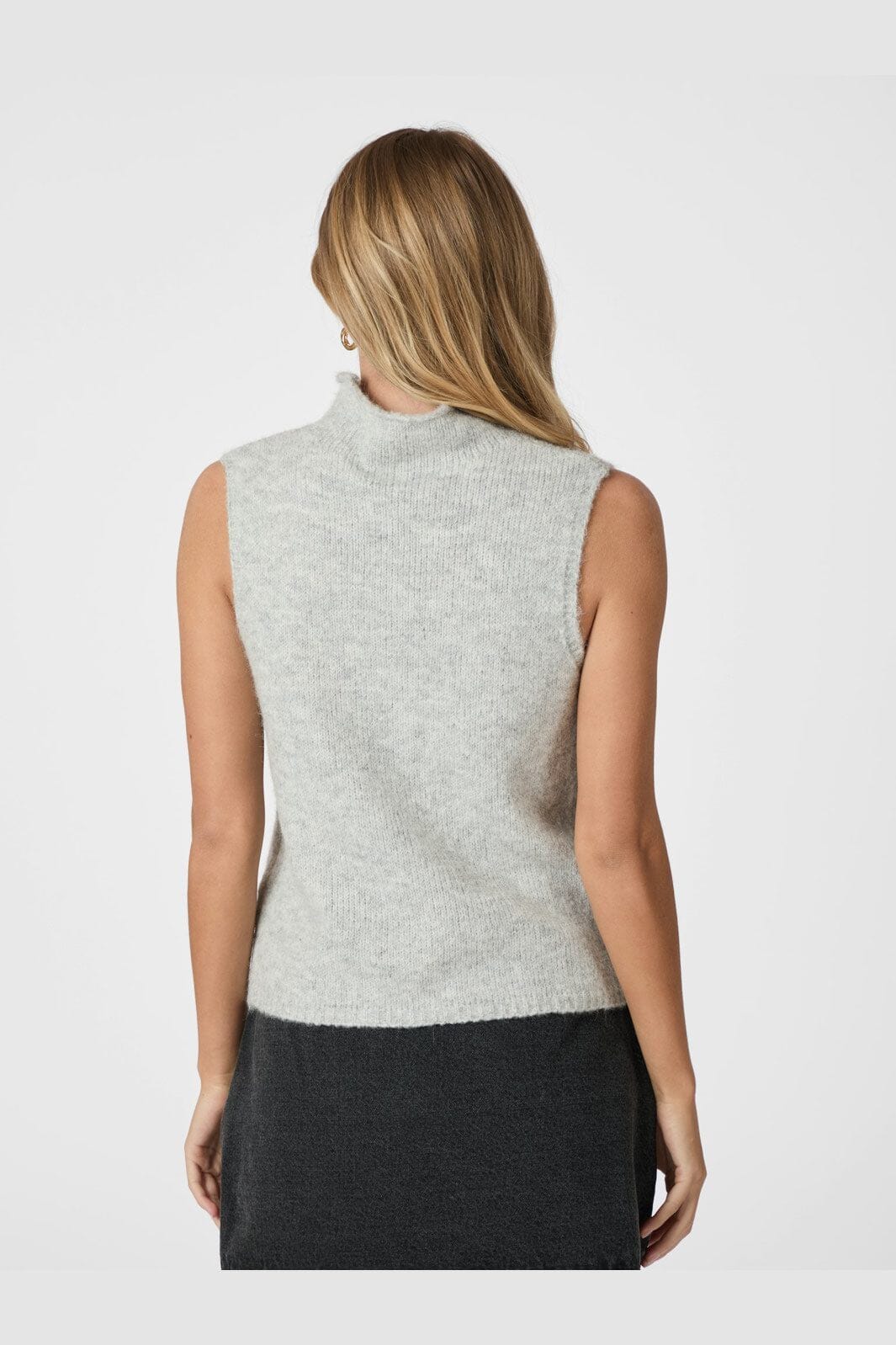 Gestricktes Top mit hohem Kragen. Das Model ist 176 cm groß und trägt Größe 36.