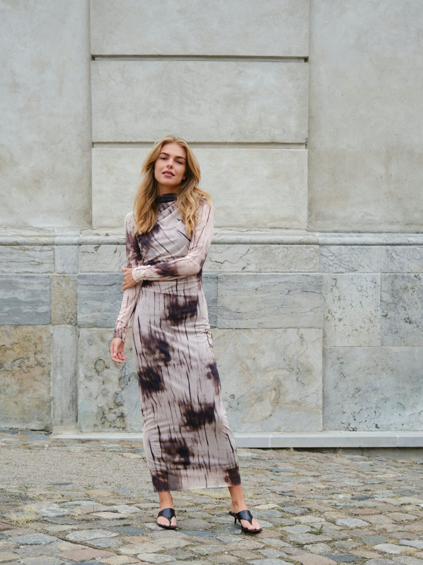 Langärmliges Mesh-Kleid von Neo Noir mit verblasstem Tie-Dye-Print in staubigen Brauntönen. Das Kleid hat einen hohen Halsausschnitt und Rüschendetails an den Seiten.