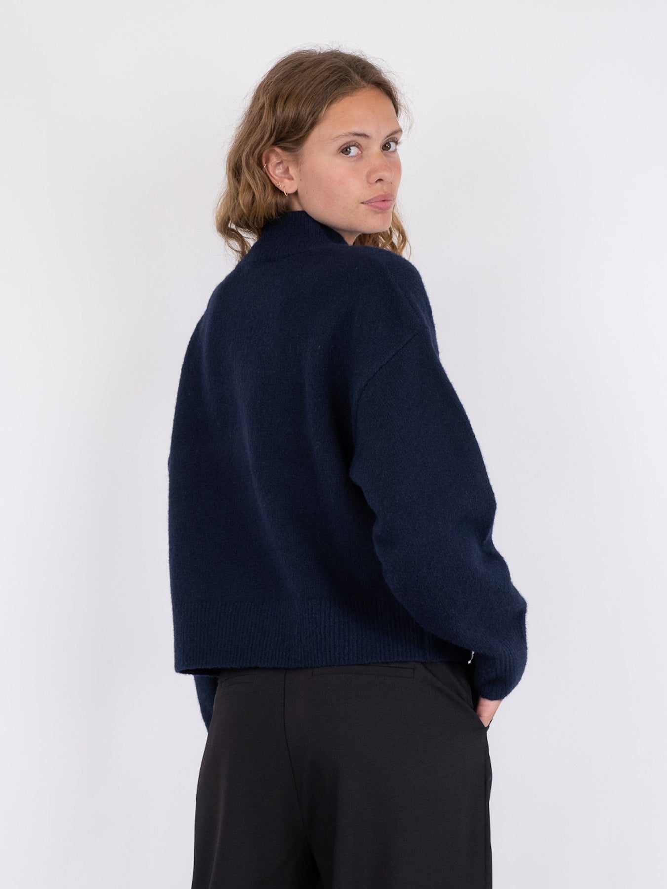 Strickpullover in Dunkelblau von Neo Noir mit hohem Kragen und cropped Länge. Sie hat eine reguläre Passform und lange Ärmel, die gute Bewegungsfreiheit bieten.