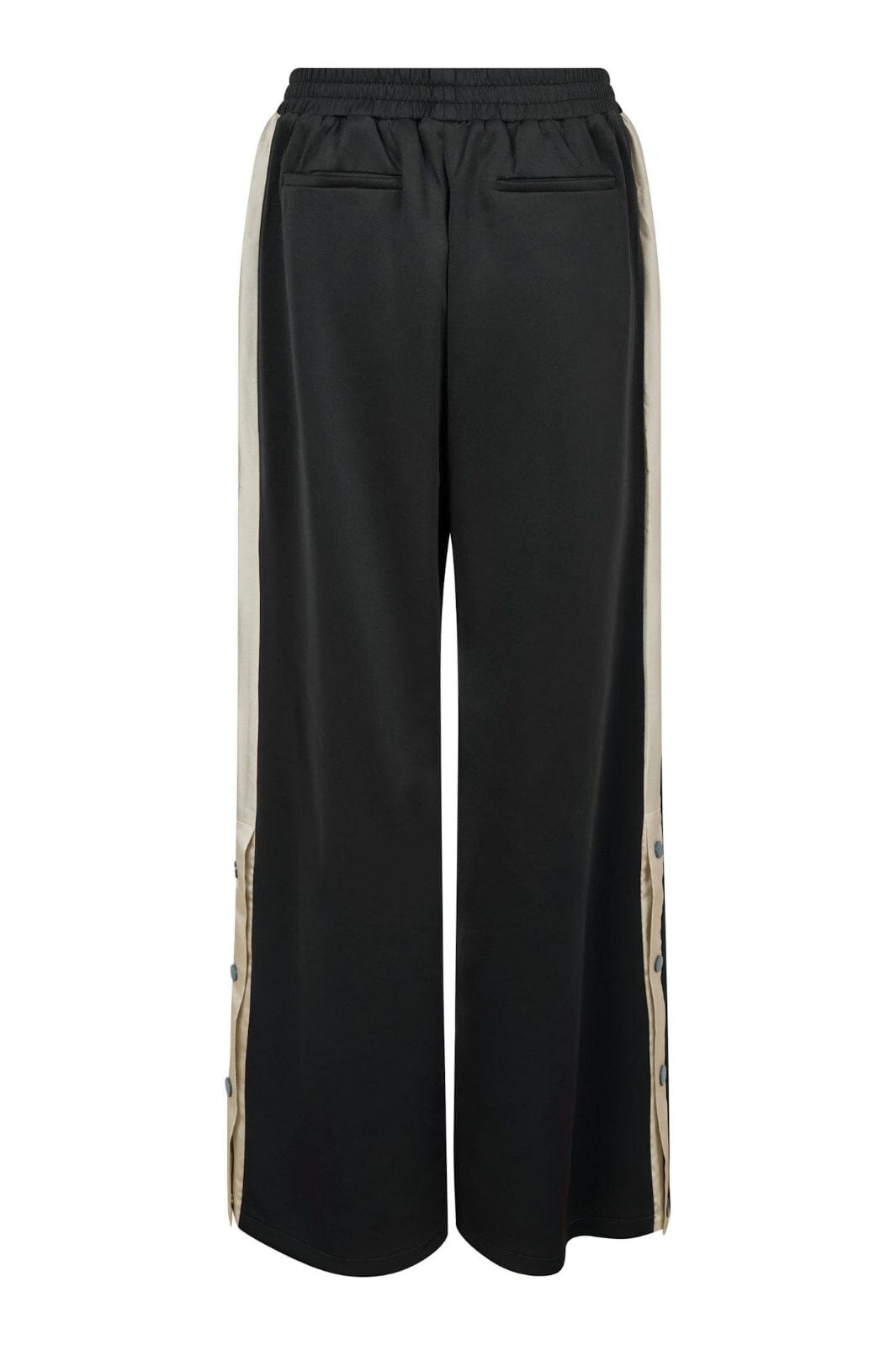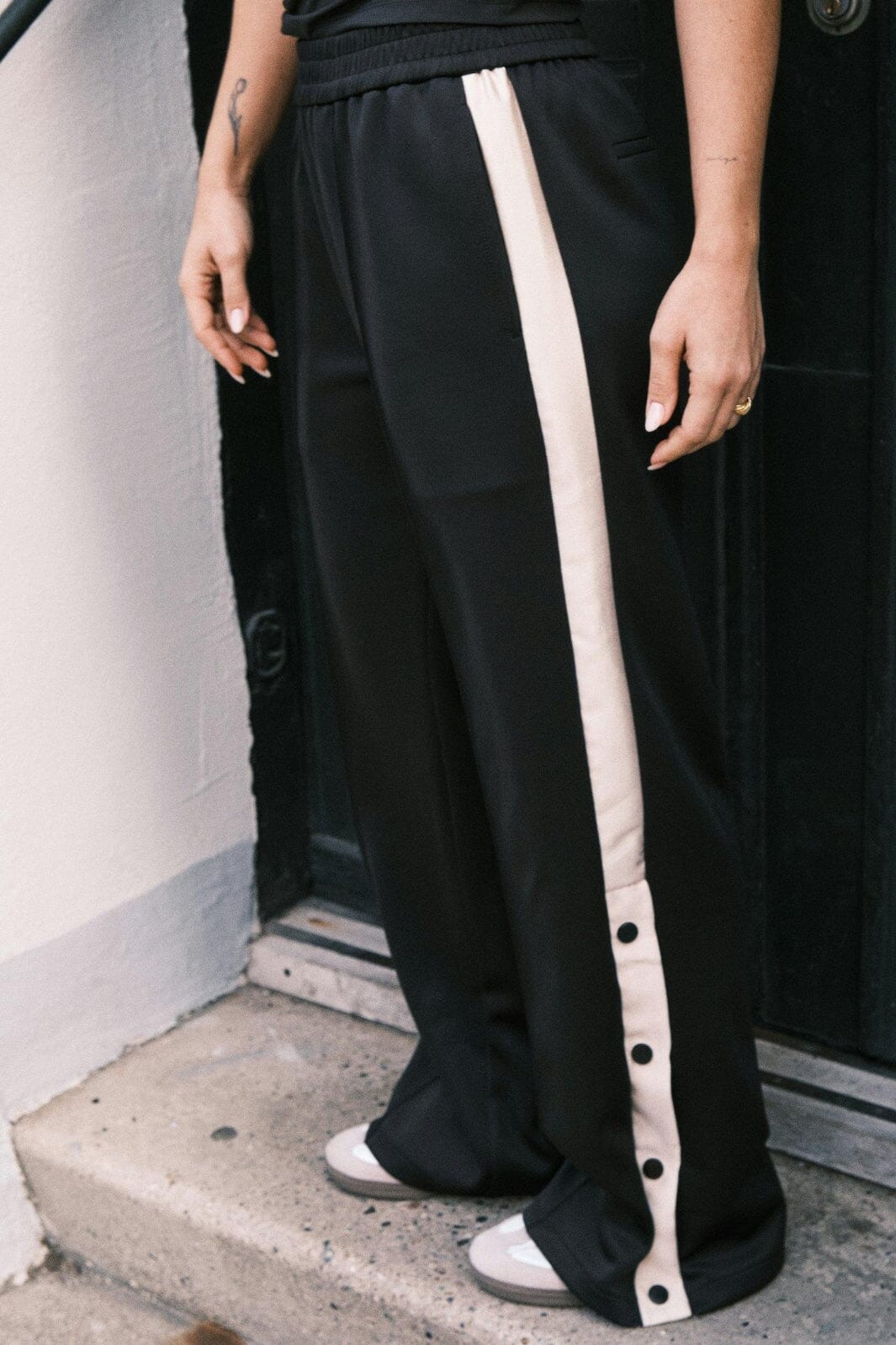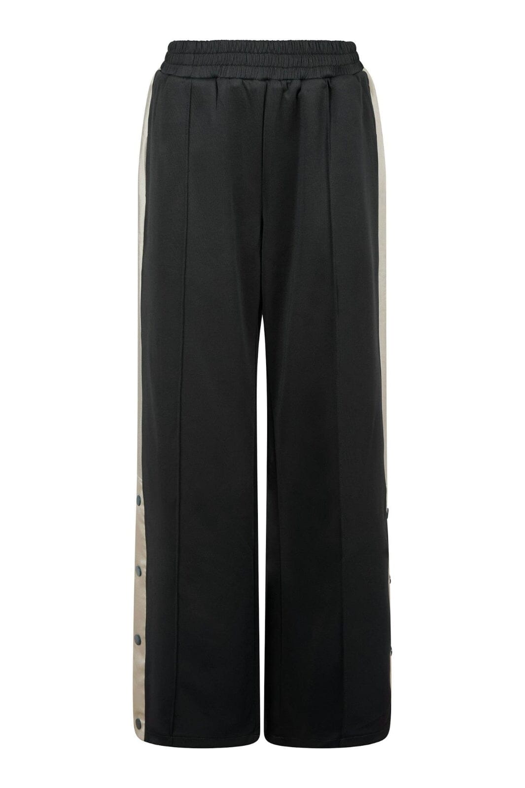 Schwarze Jogginghose von Neo Noir in Bodenlänge. Die Hose hat eine lockere Passform mit Streifendetails entlang der Beine und Knöpfen am Schlitz.