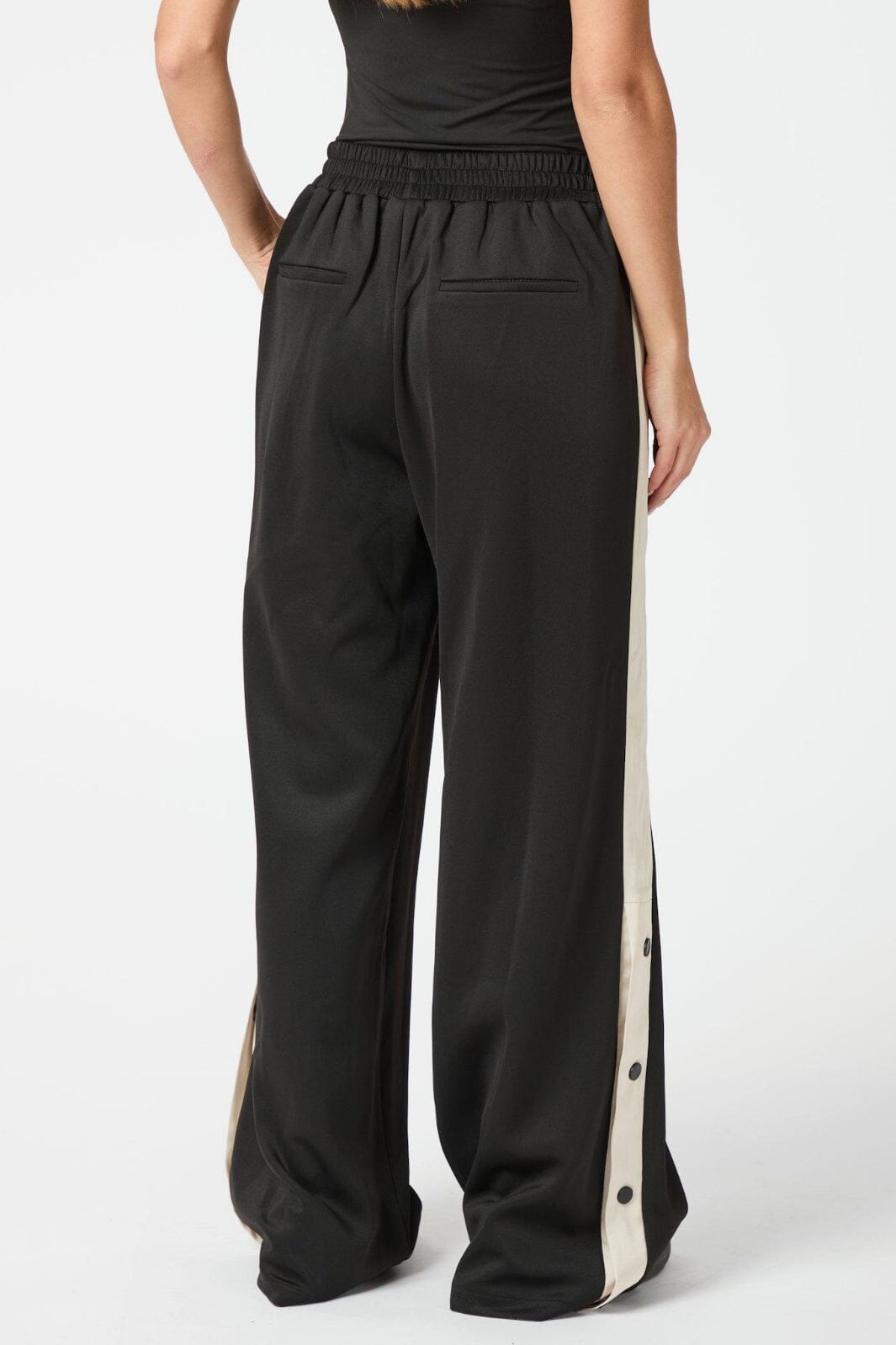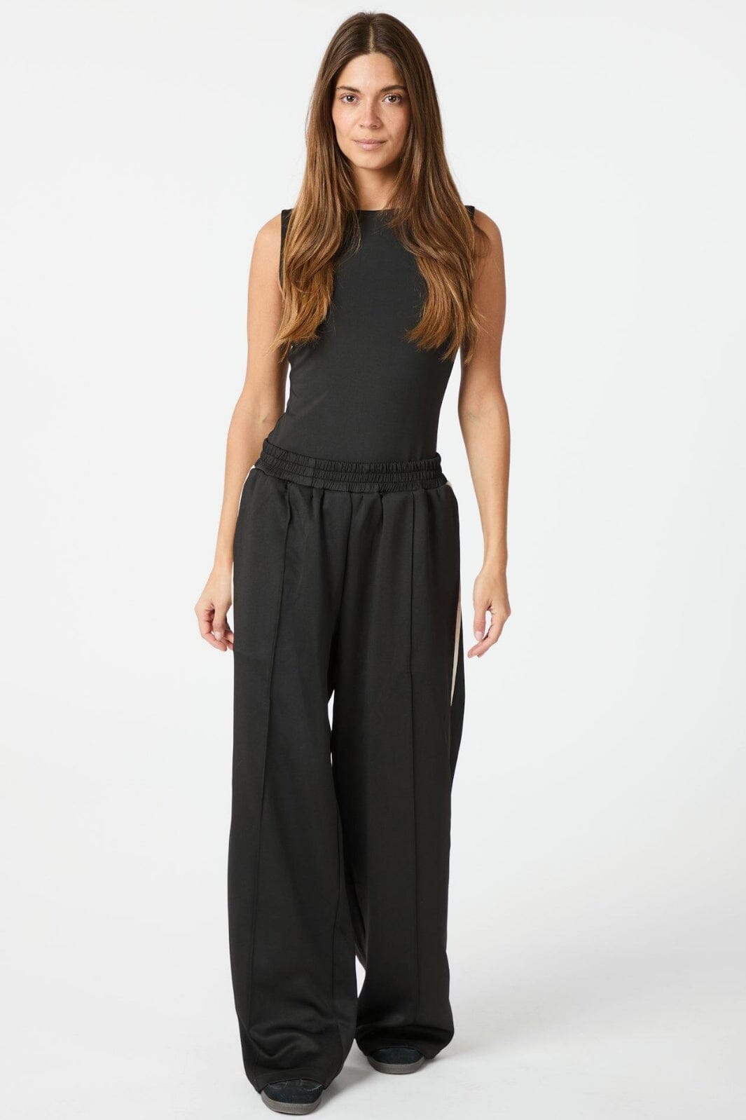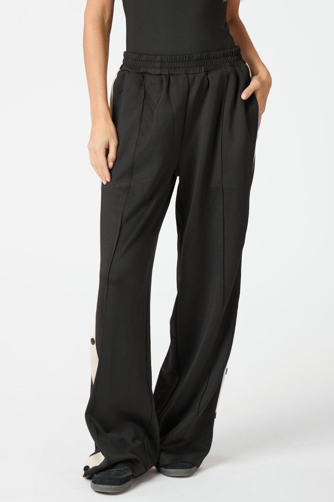 Schwarze Jogginghose von Neo Noir in Bodenlänge. Die Hose hat eine lockere Passform mit Streifendetails entlang der Beine und Knöpfen am Schlitz.
