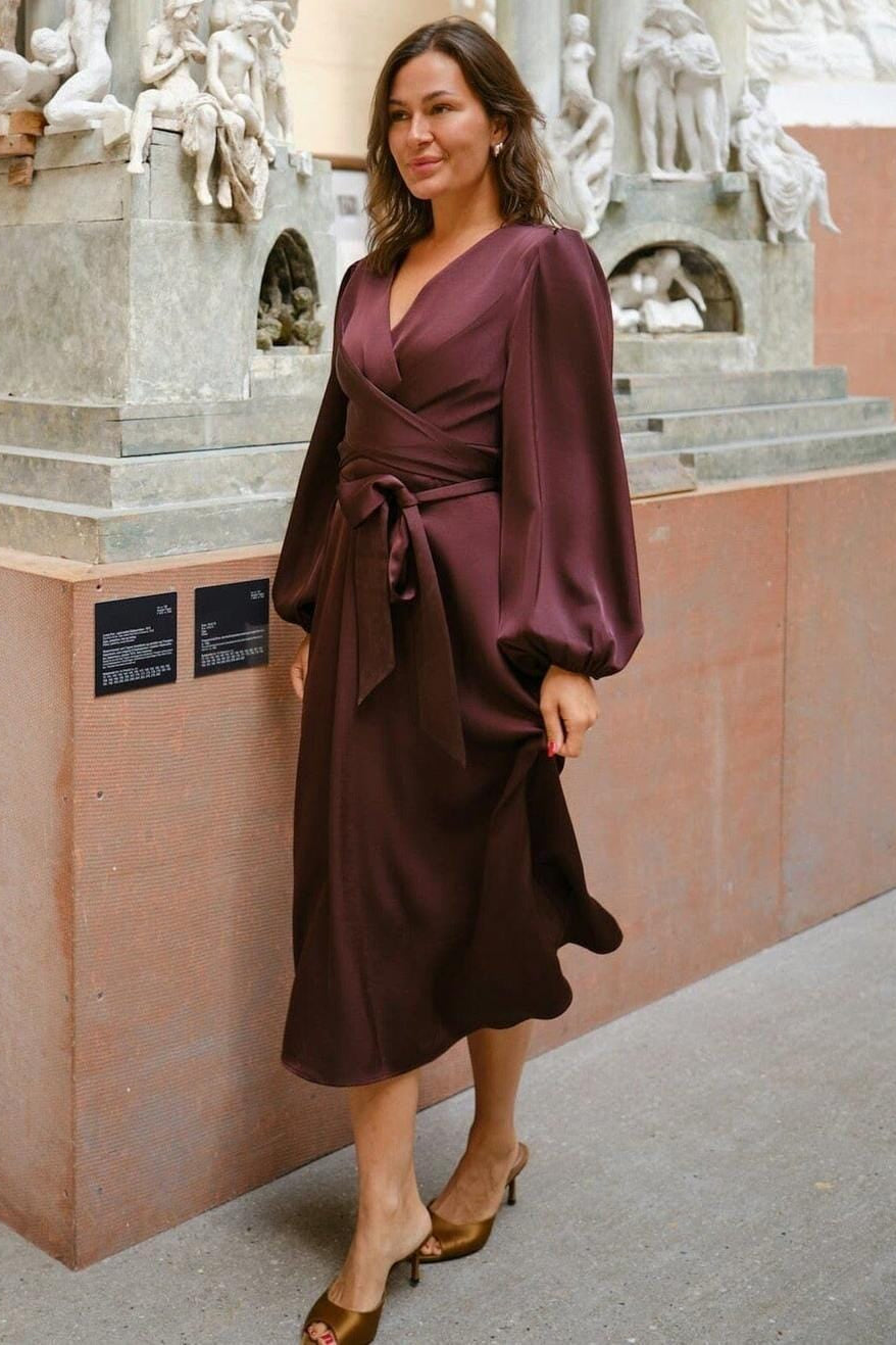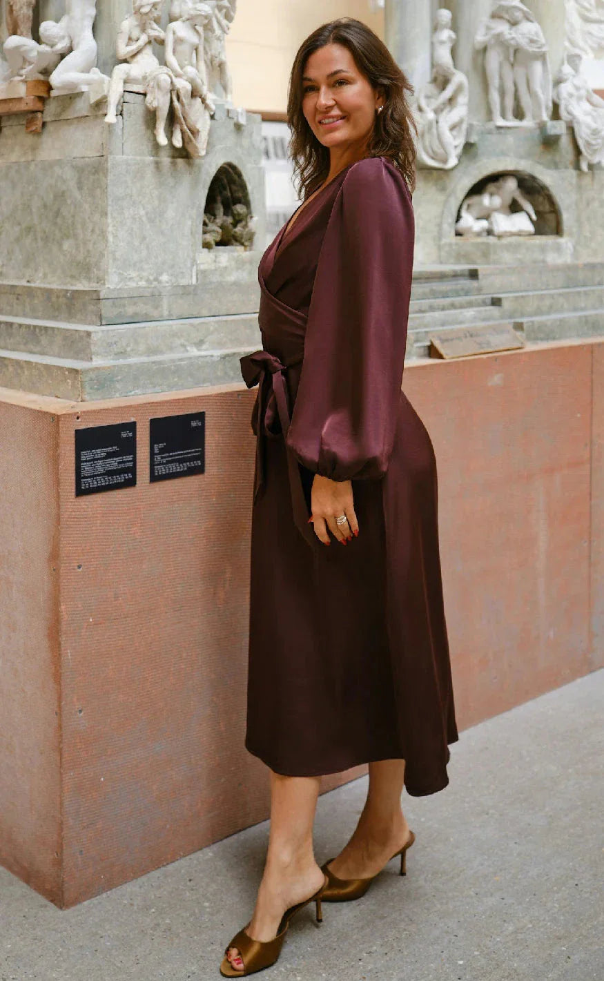 Satin Kleid von Neo Noir in dunklem Rosa. Das Kleid hat einen V-Ausschnitt, lange Ärmel mit gerafften Bündchen und ein Wickeldesign mit Bindegürtel in der Taille.