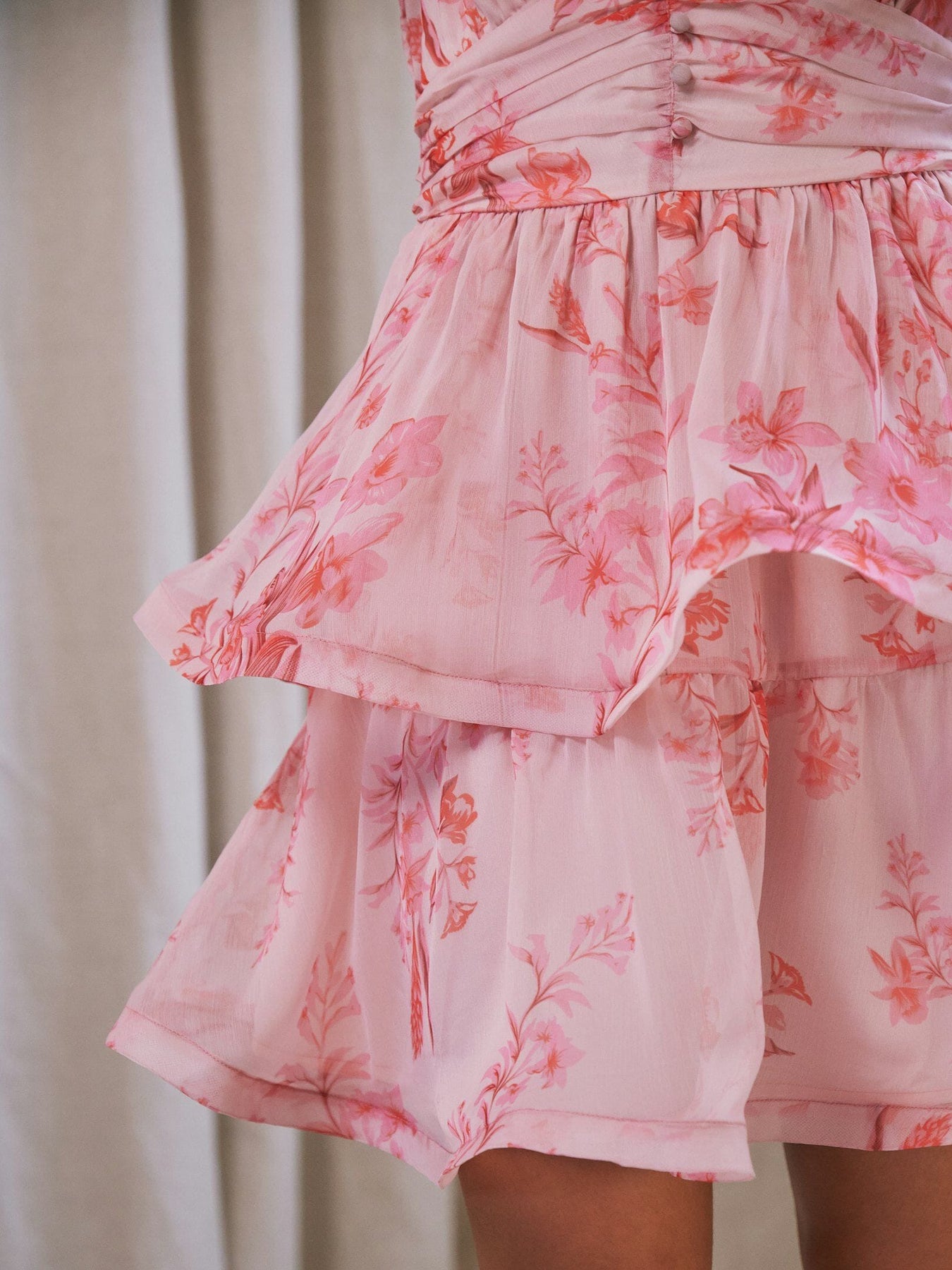 Rosa Chiffonkleid von Neo Noir mit Blumenprint in rosafarbenen Nuancen. Das Kleid hat einen Rock in Lagenoptik und ist oberschenkellang.