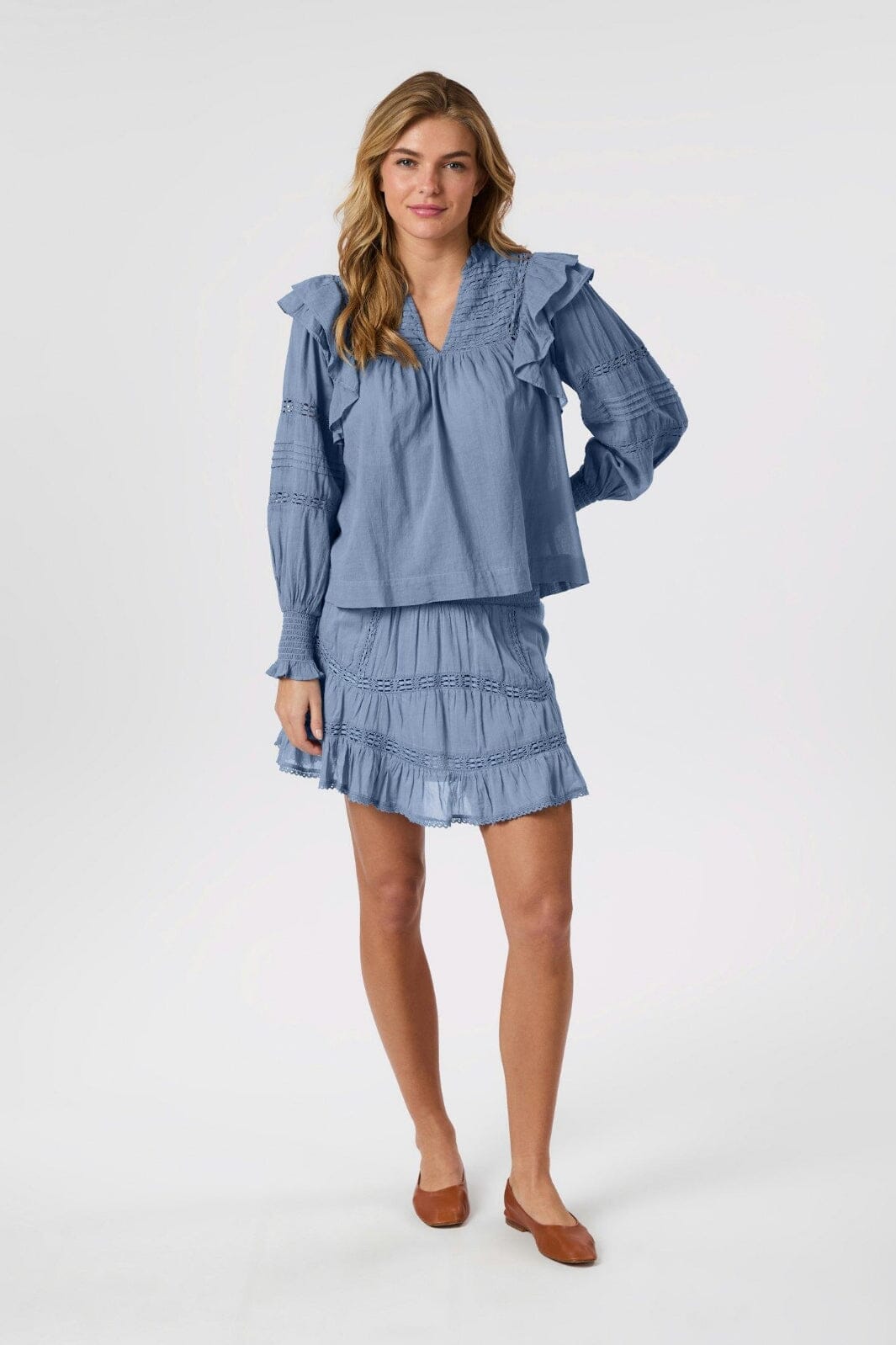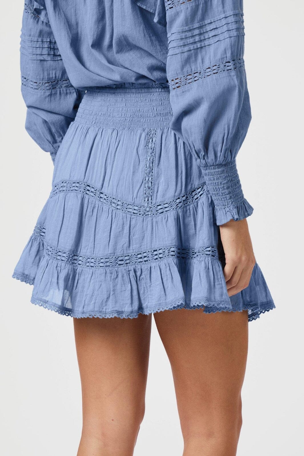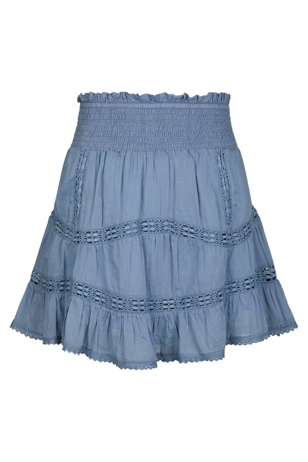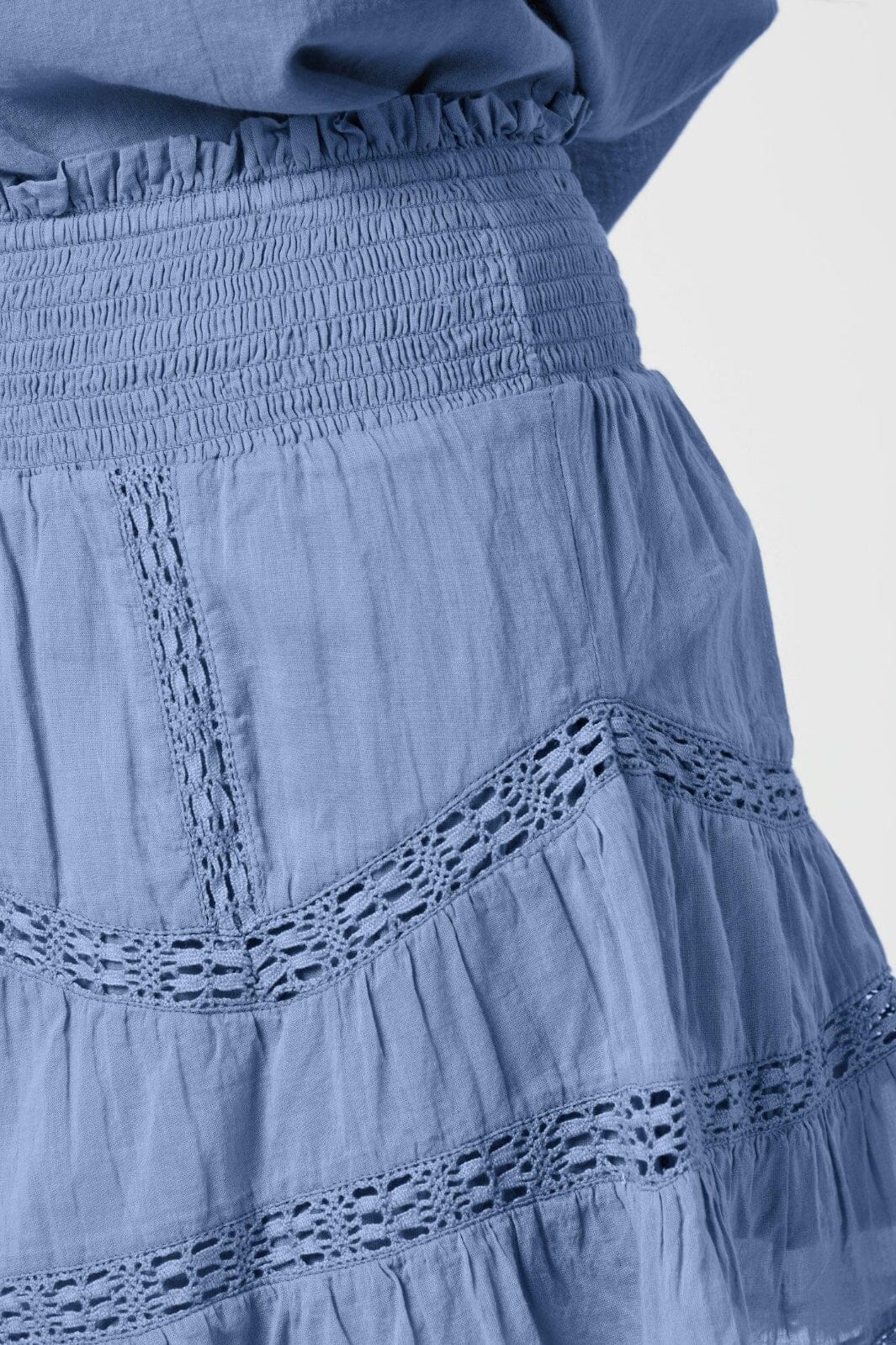 Himmelblauer Rock von Neo Noir aus Voile-Baumwolle. Der Rock hat eine hohe Taille mit Smock-Elastik und ist mit Spitzen-Details und Volants auf mehreren Ebenen verziert.