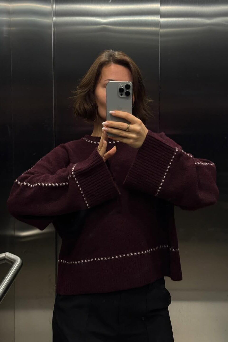 Weinrote Strickbluse von Neo Noir mit rundem Halsausschnitt und sichtbaren Nähten. Die Bluse hat eine lockere Passform und lange Ärmel mit dekorativen Nähten.