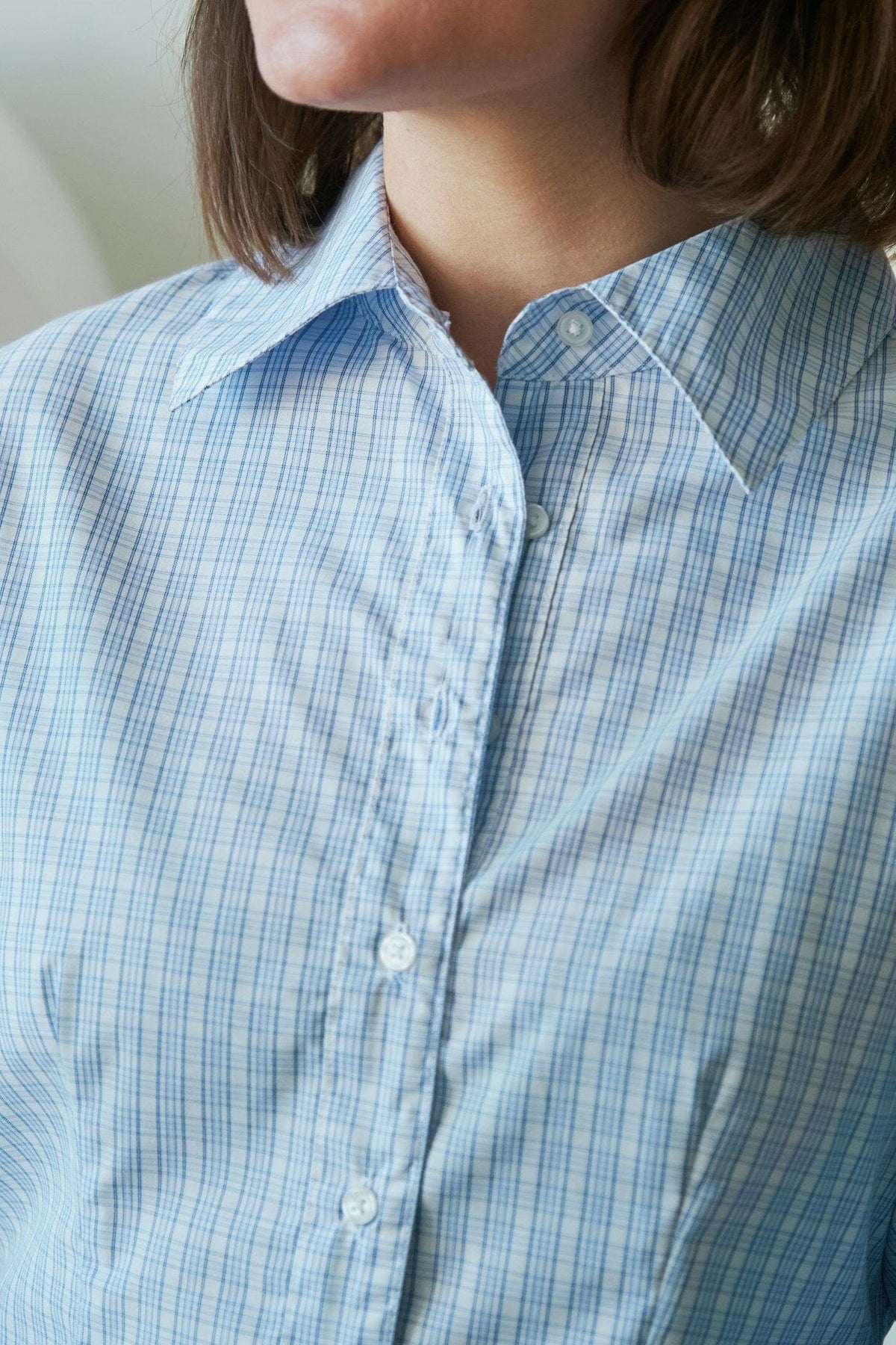 Hellblau kariertes Hemd von Neo Noir mit Slim-Fit-Passform. Das Hemd hat einen klassischen Hemdkragen und breite Manschetten an den langen Ärmeln. Die Knöpfe vorne machen es einfach an- und auszuziehen.