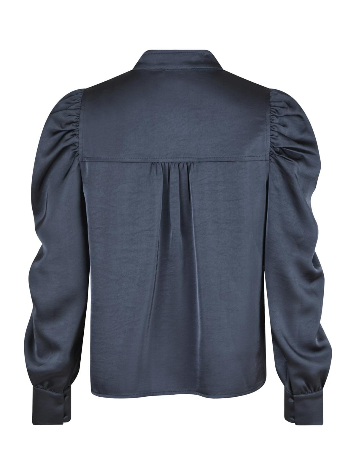 Dunkelblaue Bluse von Neo Noir aus schwerem Satin. Die Bluse hat puffige Ärmel und einen V-Ausschnitt mit Rüschen sowie eine Faltenlegung auf dem Rücken.