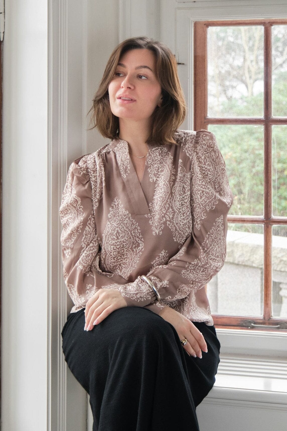 Bluse von Neo Noir in Dunkeltaupe mit Paisleymuster in hellem Kontrast. Hergestellt aus 100% Polyester mit Satin-Finish.