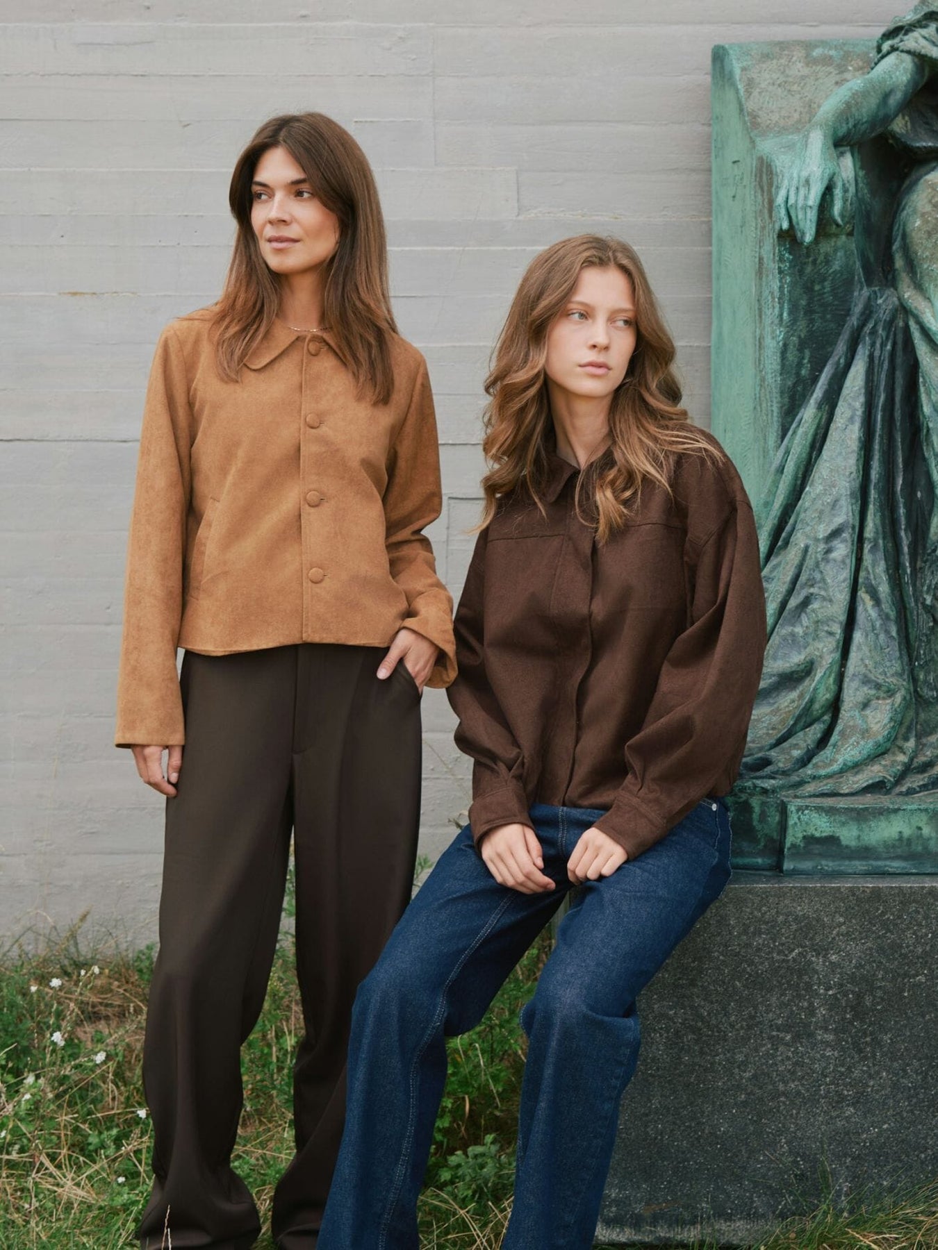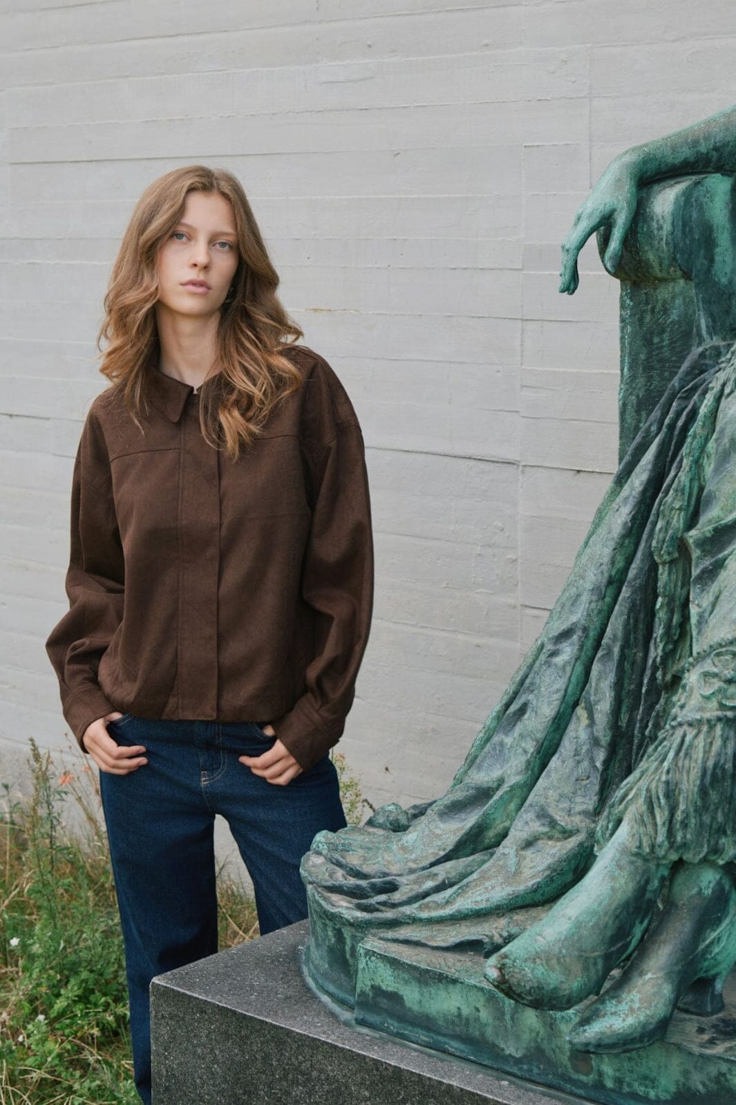 Dunkelbraune Jacke aus Kunstwildleder von Neo Noir. Sie hat eine oversized Passform mit Hemdkragen und einem verdeckten Reißverschluss vorne. Das Material hat eine weiche Oberfläche mit dekorativen Nähten.