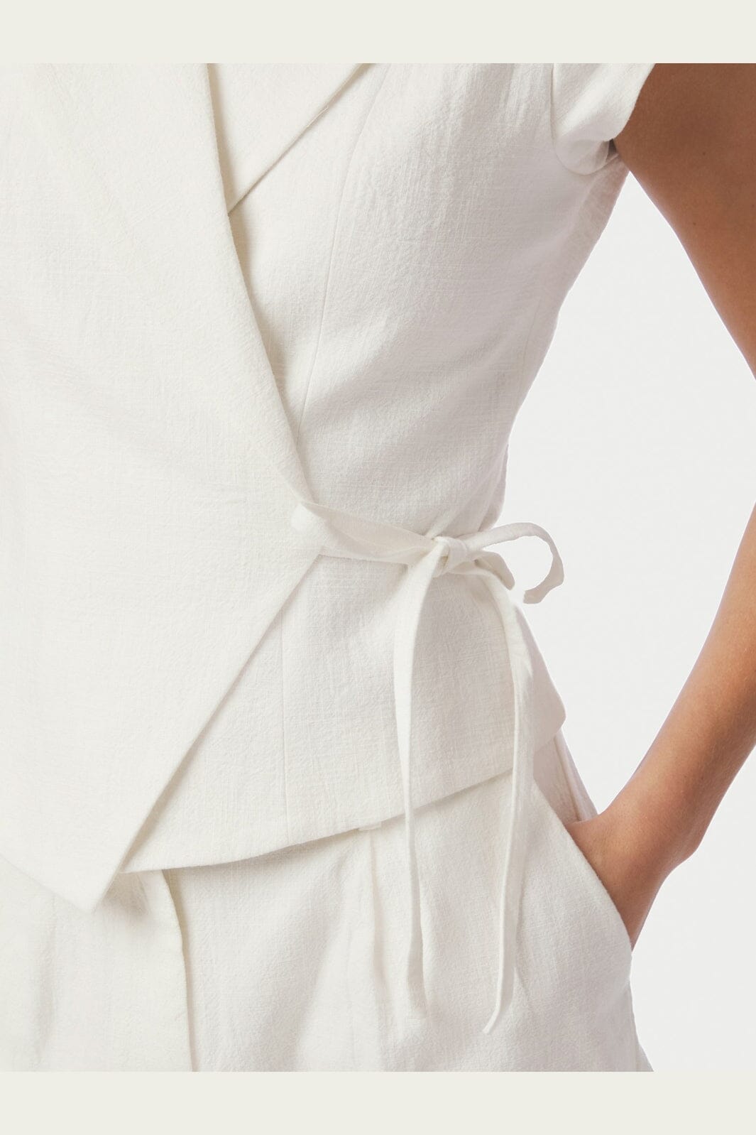 Weste von Neo Noir in einem cremefarbenen Ton. Die Weste besteht aus 80% Ramie und 20% Baumwolle, hat kurze Ärmel und einen Hemdkragen.
