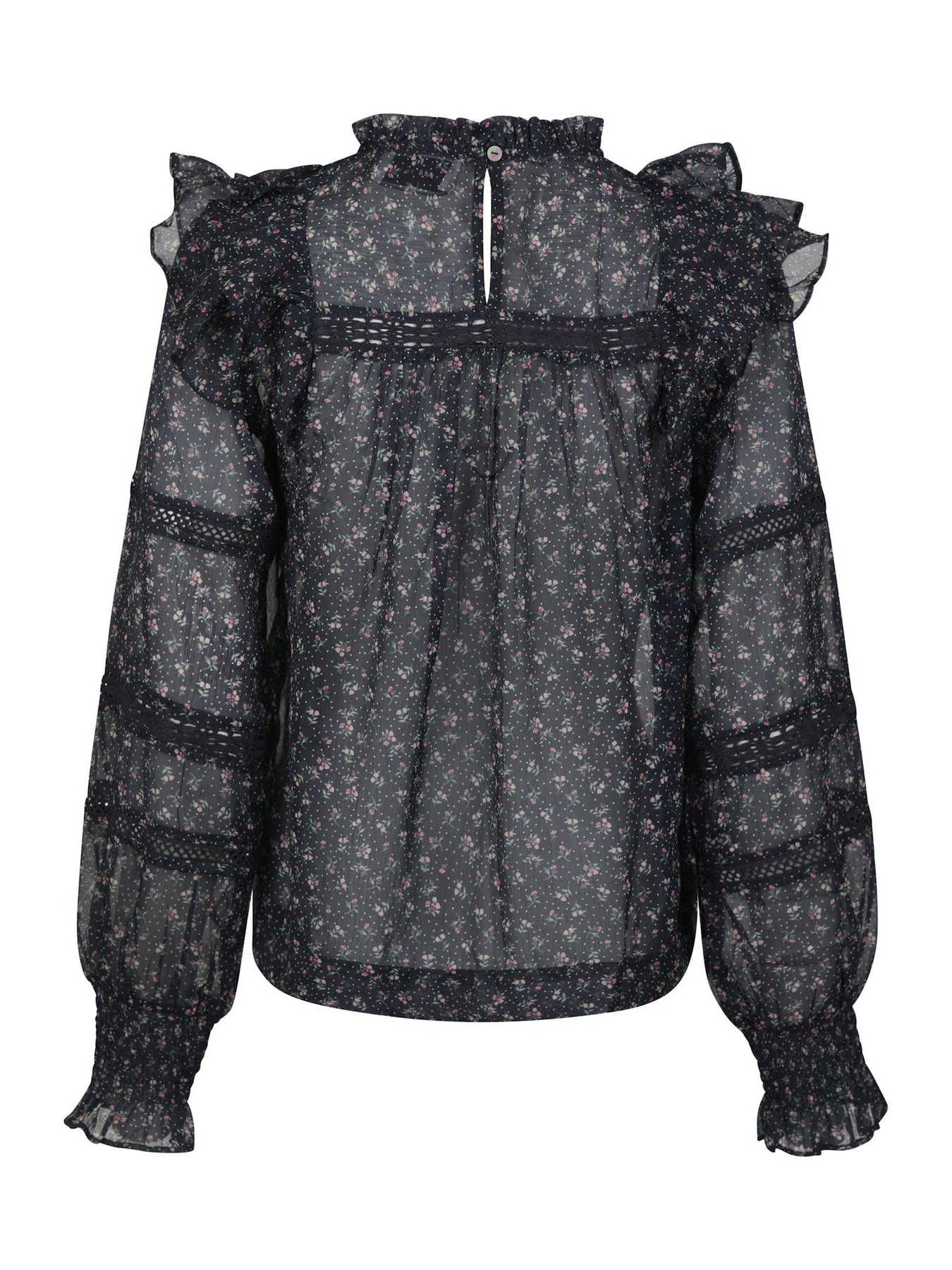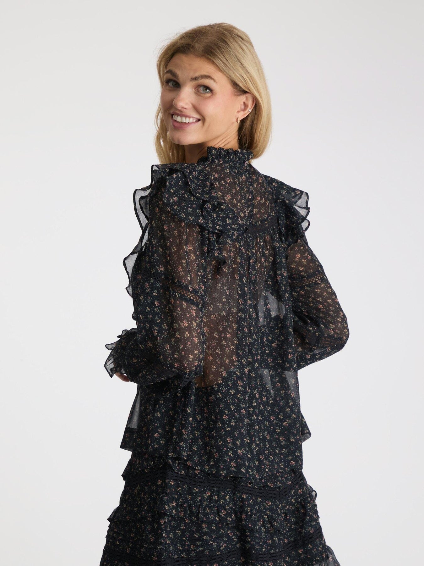 Schwarze Bluse mit Blumenmuster von Neo Noir. Die Bluse hat eine lockere Passform mit hohem Kragen und Rüschendetails. Der Stoff ist leicht durchsichtig mit einem feinen Blumenmuster.