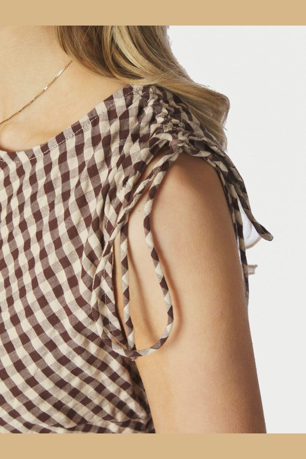 Kariertes Kleid von Neo Noir aus 100 % Baumwolle. Das Kleid ist ärmellos, hat einen schrägen Schnitt an der Hüfte und Schnürdetails an der Schulter.
