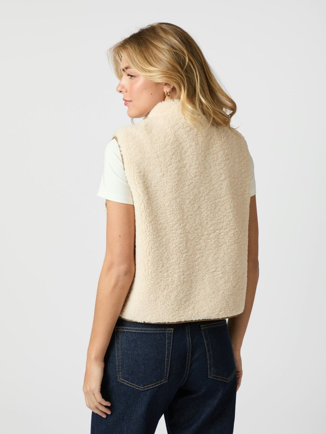 Teddyweste von Neo Noir in Off-White mit braunen Kontrasten. Die weiche Teddy-Textur kombiniert sich mit gesteppten Taschen und hohem Kragen. Der Reißverschluss vorne macht die Weste praktisch im Gebrauch.