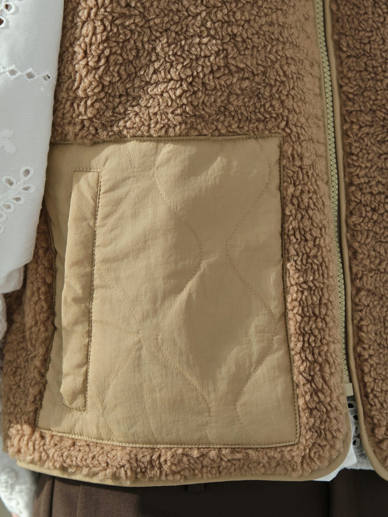 Ärmlose Weste von Neo Noir aus weichem Teddy-Material in einem braun-beigen Farbton. Die Weste hat einen hohen Kragen und einen Frontreißverschluss mit kontrastfarbenen Taschen.