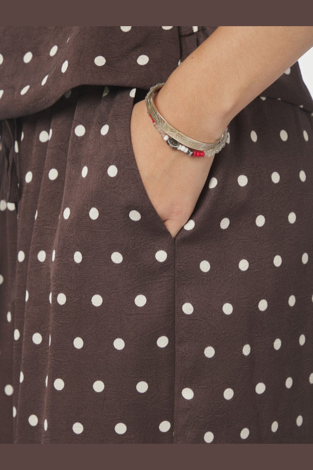 Dunkelbraune Hose von Neo Noir mit weißen Punkten. Hergestellt aus 100 % Polyester mit einer lockeren Passform und bodenlanger Länge.