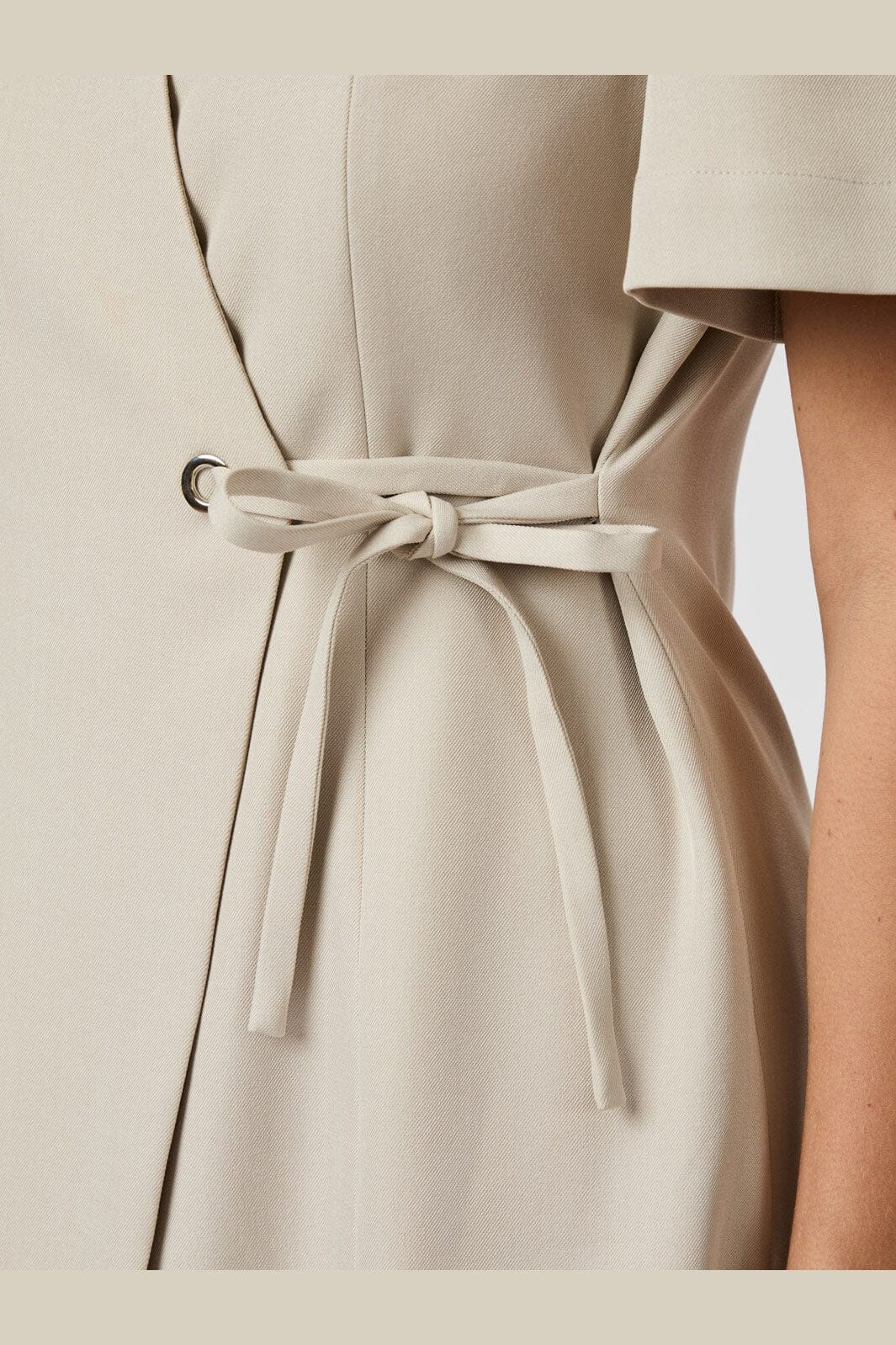 Sandfarbene Kleid von Neo Noir mit kurzen Puffärmeln. Das Kleid hat eine figurbetonte Passform mit Wickeldesign und einem Metallring mit Bindeband in der Taille.