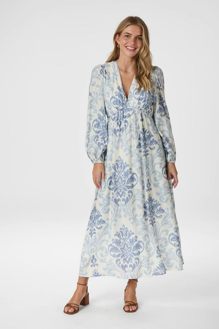 Langes Kleid von Neo Noir in Hellblau und Weiß mit Blumenmuster. Es hat einen tiefen V-Ausschnitt und lange Puffärmel mit Gummizug am Ärmelabschluss.