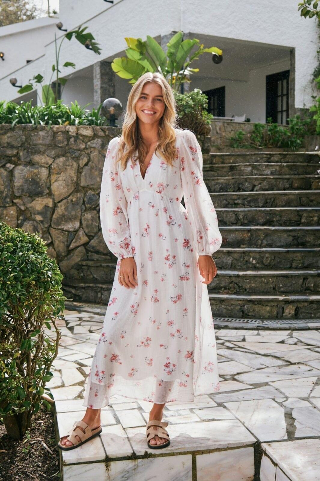 Knöchellanges Kleid von Neo Noir in Weiß mit rosa und grauem Blumenmuster. Das Kleid hat Puffärmel, einen V-Ausschnitt und eine semi-lockere Passform, die gute Bewegungsfreiheit bietet.