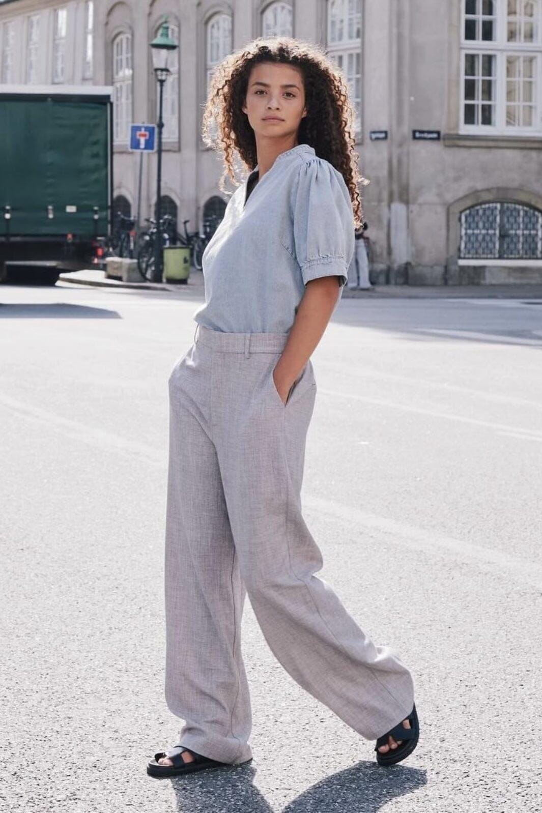 Denimbluse von Neo Noir aus stonewashed Denim. Die Bluse hat einen V-Ausschnitt mit Bindebanddetail und kurzen puffigen Ärmeln. Das hellblaue Stonewash verleiht einen lässigen Look.